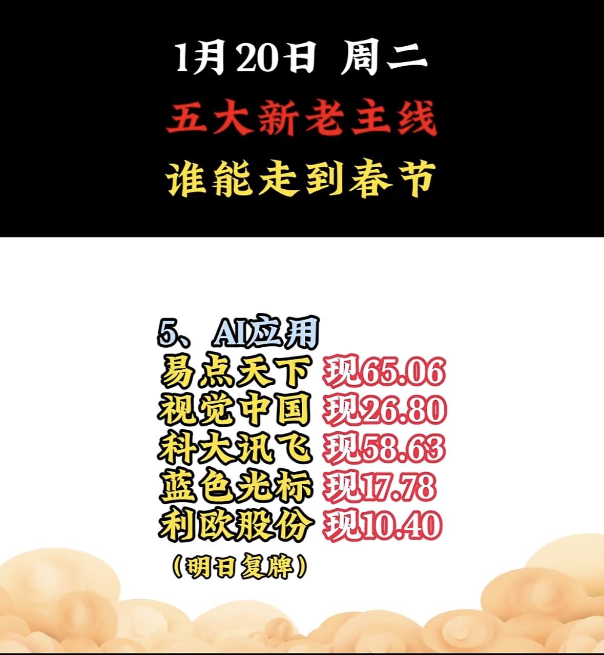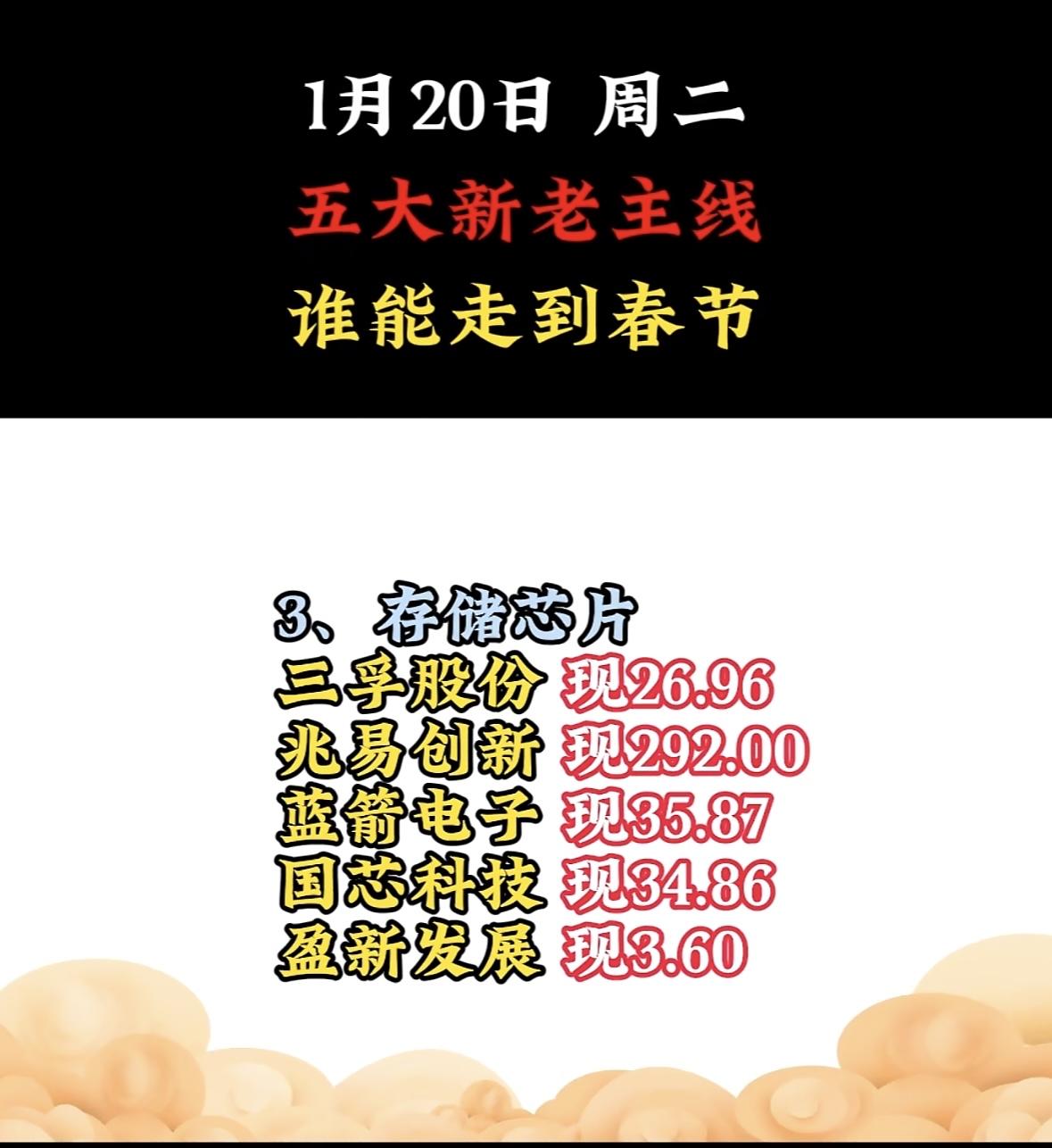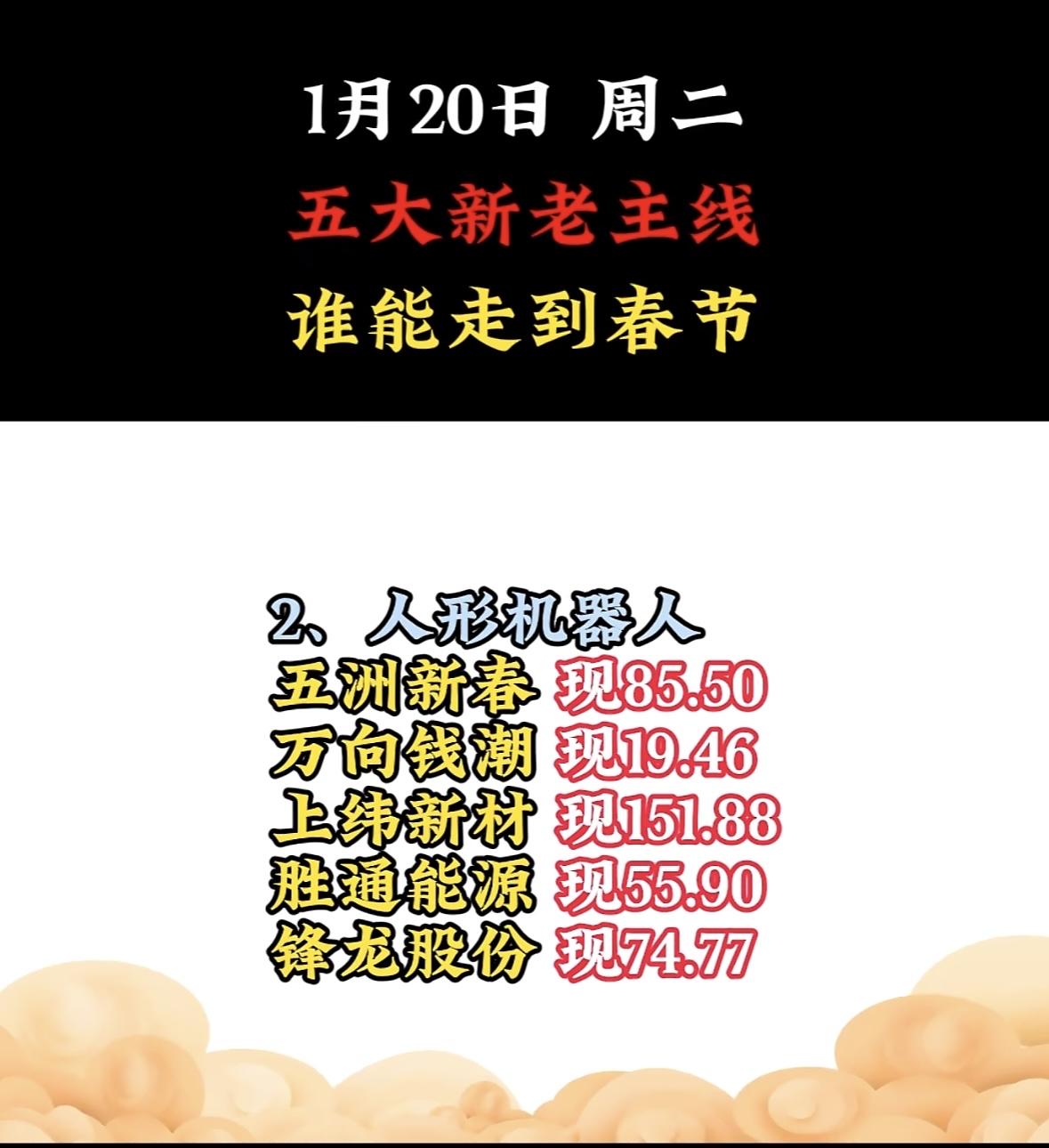 “五大新老主线,谁能走到春节?”🎉📈💰 五大主线争锋,电网设备领跑春节行情,龙头股表现抢眼,市场热度持续升温。 1月20日五大主线争锋,电网设备板块领跑,多股表现亮眼,谁能持续领涨至春节?