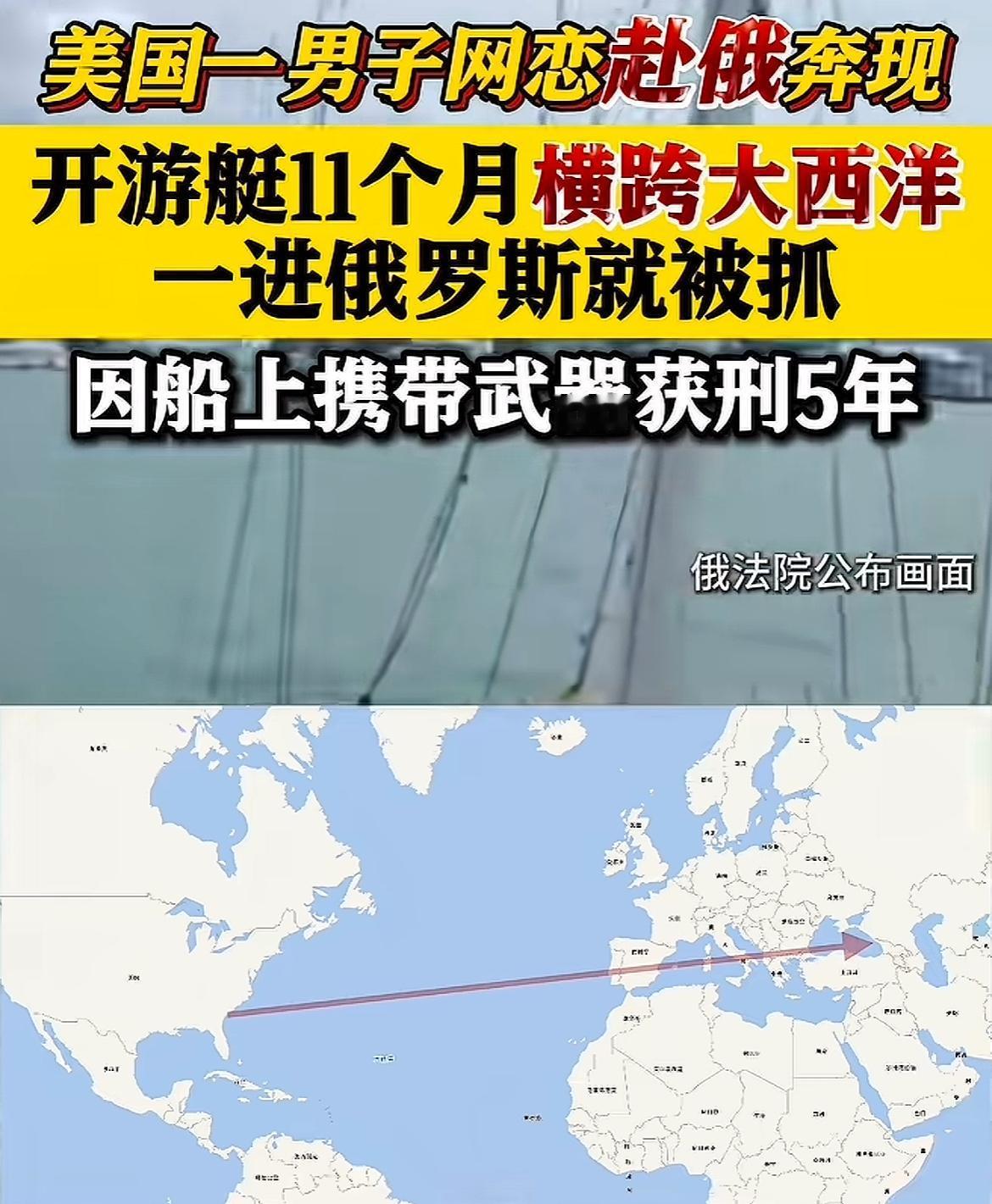 飘洋过海来坐牢?[笑哭] 看到一个新闻,美国一男子为了见网恋的俄罗斯女网友,开着游艇,横跨大西洋,然后辗转多国海域,最后终于到了俄罗斯,结果因为携带了武器,被俄罗斯法院判刑5年[捂脸] 突然想起以前的一首老歌,《漂洋过海来看你》, 只不过,歌词可能要改成“ 为你我用了半年的积蓄,漂洋过海的来坐牢”[捂脸] 网恋 美国 俄罗斯 女网友 网友