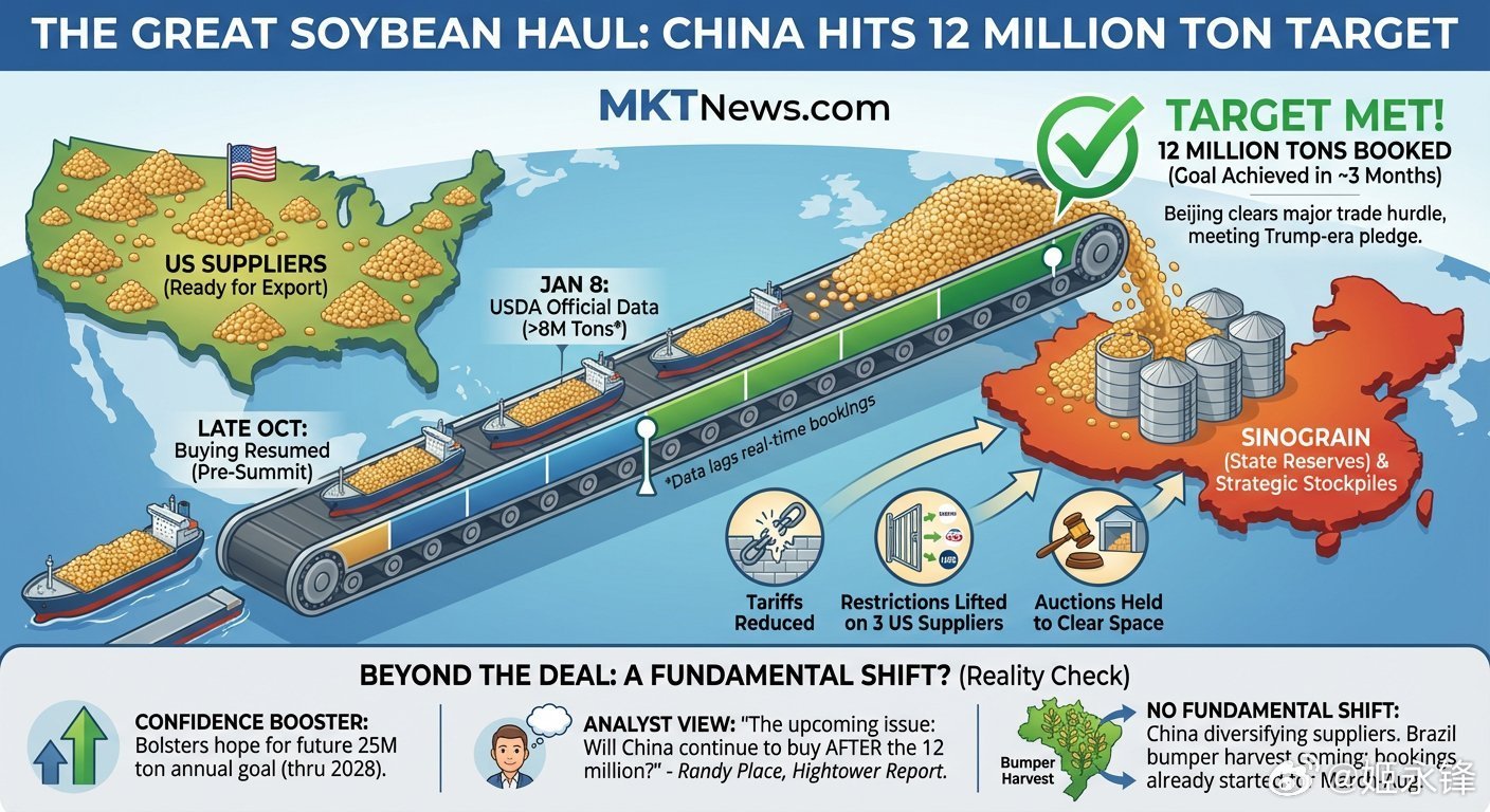 🇨🇳🇺🇸中国购买1200万吨美国大豆,兑现关键贸易承诺据熟悉装运情况的贸易商透露,过去三个月中国已购入约1200万吨美国大豆,履行了11月向特朗普政府做出的重要贸易承诺。这轮主要由国企为战略储备进行的采购潮,是在此前数月回避后的突然加速,得益于中国下调关税并取消进口限制。尽管这一目标已达成,贸易商正关注中国是否会继续购买,以实现到2028年每年2500万吨的更大采购量,尤其在其已开始预订巴西新豆之际。