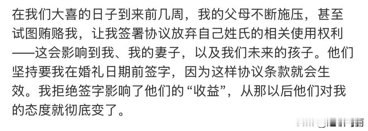 布鲁克林贝克汉姆控诉父母 在结婚登记前 让他签署相关协议 放弃一些Beckham姓氏的权益……父母为之计深远反而成为雷点了[再见] 这难道不是Nicola Peltz让大布签署婚前协议在先吗?人家可以保全自己的财产 贝克汉姆家就不行吗……结果就是大布签了老婆的婚前协议 但父母的协议拒签[泣不成声] 很多人说贝家把Nicola Peltz这个“儿媳妇”当外人来防……难道赘婿就真的被犹太大家族接纳了当自己人了?那为啥还要签婚前协议呢…… 要知道Nicola有10几个兄弟姐妹 她连家族生意的边儿都不沾 每个月领十几分之一的信托基金度日 都要被签婚前协议 怎么性转一下就被🥊了呢