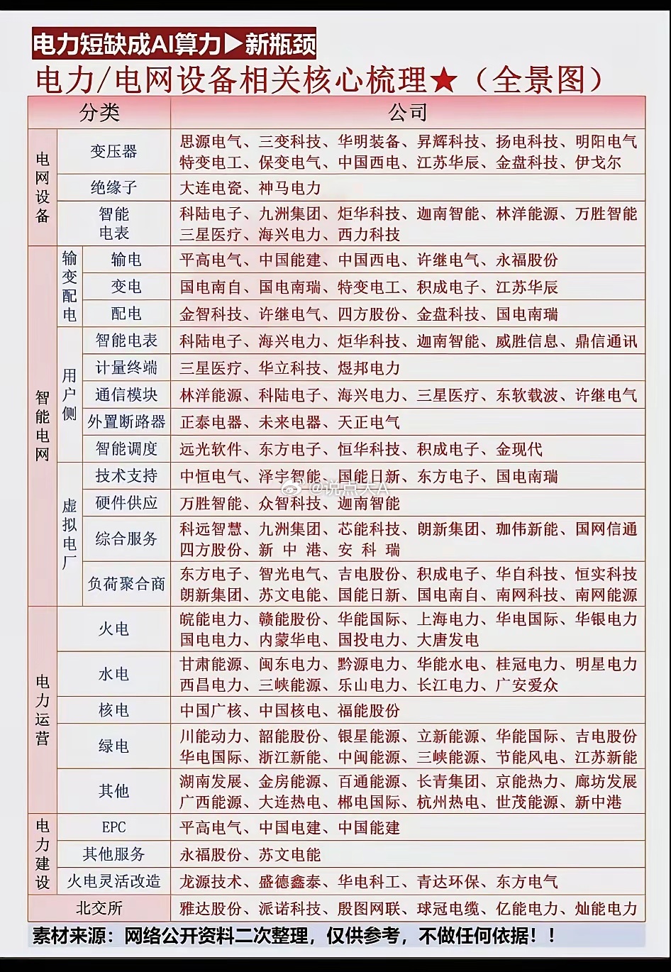 电力短缺引爆千亿电网投资!但主力抢筹的并非“电线电缆”,而是这份“电网调度大脑”清单“电力短缺成AI算力新瓶颈”的警示已从行业研讨变为现实焦虑。 您提供的这张全景图,在详尽罗列变压器、电表等传统设备公司的同时,更以醒目的篇幅将“智能调度”、“虚拟电厂”、“技术支持”单独归类——这揭露了本轮电网投资的真正内核:解决缺电矛盾,不能只靠多建电厂和拉电线,核心在于提升现有电网的“智能化调度能力”与“柔性调节能力”。 主力资金的枪口,正从硬件基建,转向软件与系统。反共识逻辑:市场惯性思维是“缺电就利好所有电力设备公司”,但产业矛盾在于 “源荷双重波动” (新能源发电不稳、AI算力负荷激增)。因此,投资价值最大环节,是能平抑波动、优化效率的“软件、算法与聚合平台”,而非标准化硬件。图中,国能日新(功率预测)、东方电子/恒实科技(虚拟电厂聚合)、泽宇智能(智能运维) 等公司,提供的是电网的“感知神经”和“决策大脑”,其成长性和利润率模型将优于传统制造。产业链价值排序:从“控制力”到“承载力”根据图表,受益环节的确定性排序如下:1. 调度与聚合(核心增量):虚拟电厂(负荷聚合商)与智能调度是解决尖峰负荷的关键,政策驱动明确。2. 感知与交互(确定性需求):智能电表、通信模块是数据基础,将随智能化改造持续放量。3. 传统设备与运营(稳健基础):变压器、开关、及发电运营商,受益于总量增长,但格局稳定,需精选龙头。关键观察指标:1. 跟踪政策节点:各省电力现货市场全面运行时间表,及需求响应补贴力度,这是虚拟电厂商业化的生命线。2. 验证订单质量:关注国能日新、东方电子等公司,是否获得电网或大型工商业用户的 “智能化调度”或“负荷聚合”运营项目,而不仅是硬件销售合同。留给读者的问题:在电网走向“源网荷储”互动的时代,你认为最大的投资机会在于提供“智能调度与聚合”服务的软件平台商,还是作为电网基石的“传统电力设备”制造商?评论区聊聊你的逻辑。(注:以上分析基于您上传的产业图谱及公开信息梳理,所提及公司仅为该分类下举例,不构成任何投资建议。)