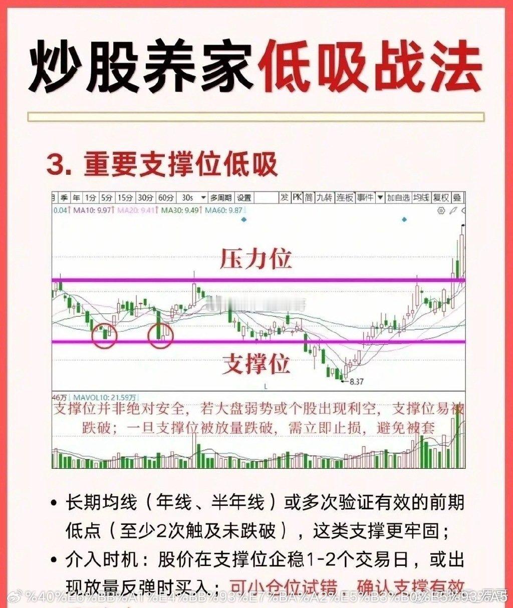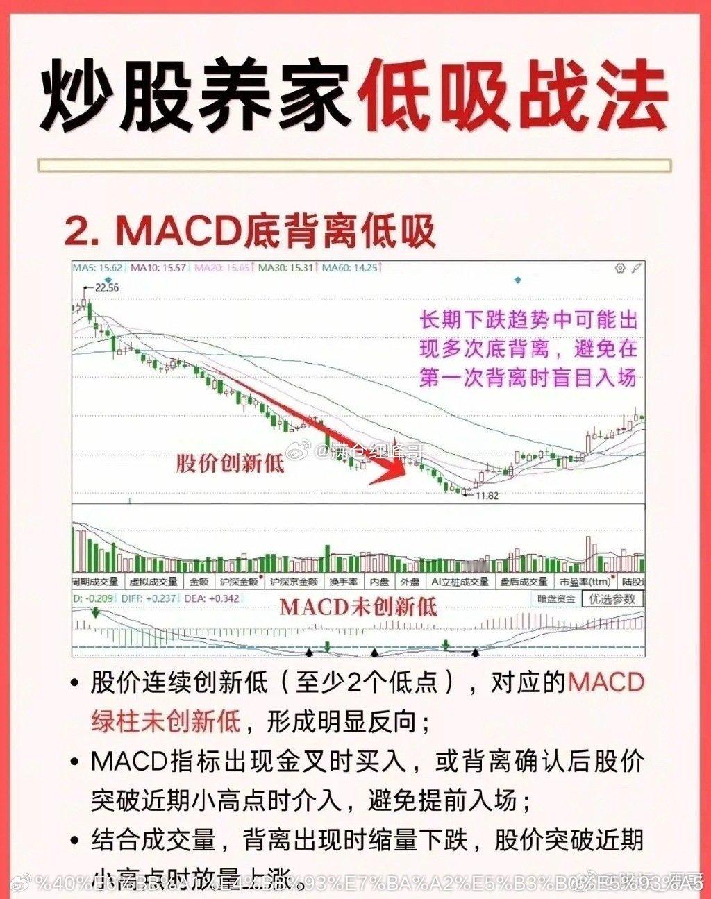 炒股养家必看的知识科普!炒股养家的分时图技巧全在这了,从买卖信号的基础判断,到主力诱多、动能衰竭的风险识别。再到封板形态和多空趋势转换的盘面解读,一张张图把分时图的核心逻辑讲得明明白白。炒股养家的四大低吸战法, 从放量突破后的回踩低吸,到MACD底背离的信号捕捉,再到重要支撑位的企稳介入。以及上升趋势中均线不破的低吸技巧,四张图把低吸的核心逻辑和实操要点讲得透透的。不过股市没有绝对的公式,这些技巧仅供学习参考,实际操作还得结合盘面和自身策略。毕竟风险永远要放在第一位。理财有风险入市需谨慎!