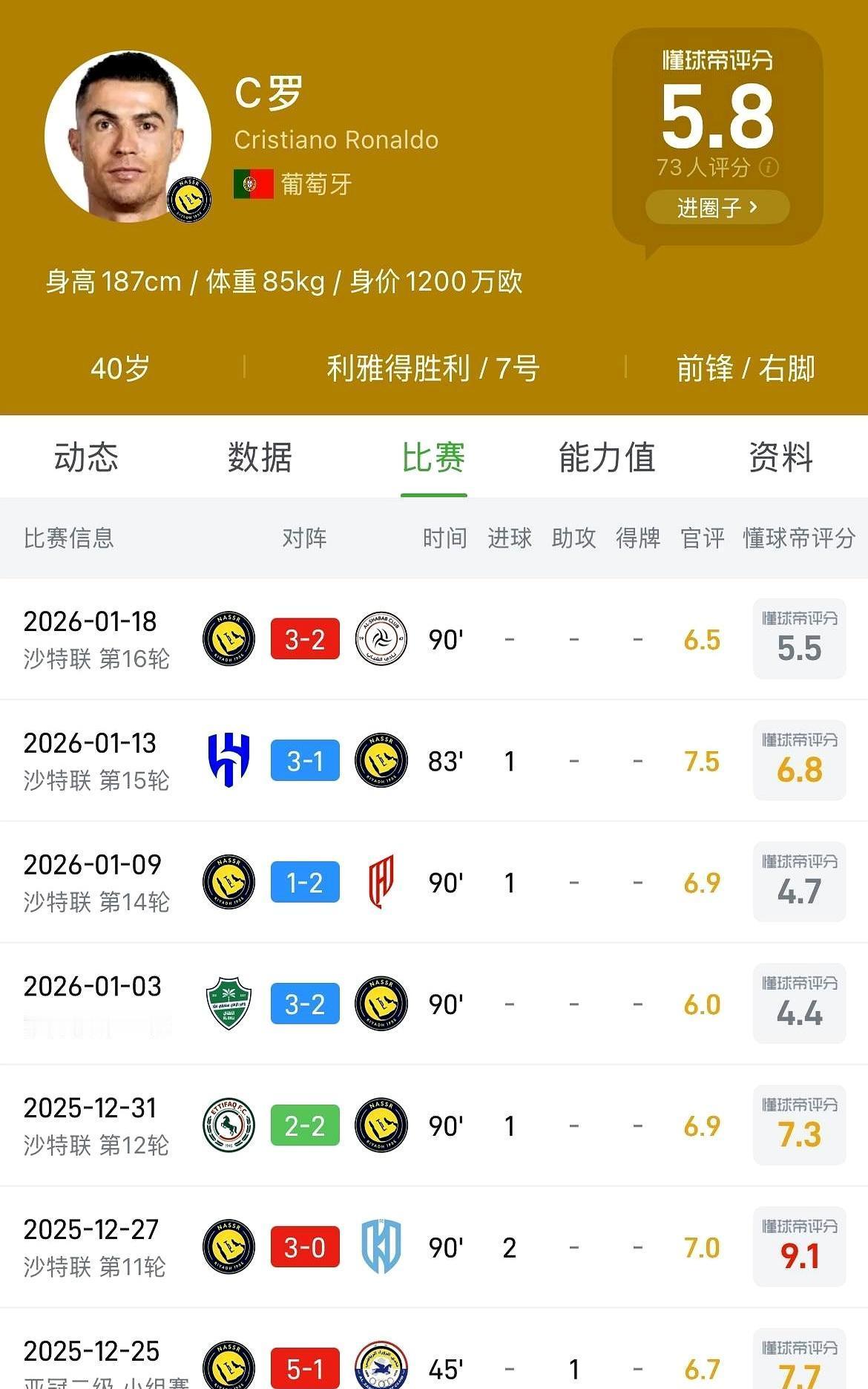 7场球,梅西把迈阿密扛在肩上:7球8助,评分8+是日常,两场满分。球队赢,他喂饼也自己吃,冠军直接揣兜里。 再看C罗,5球1助,评分6徘徊,饼到嘴边才踹进去。利雅得4轮丢11分,离榜首7分,他刷到957球,球队却越刷越远。 一个让队友升级,一个靠队友续命。 同样奔2026,有人想带队圆梦,有人只想圆自己的四位数。数据摆这儿,谁还在踢球,谁在拍纪念册,一眼看清。