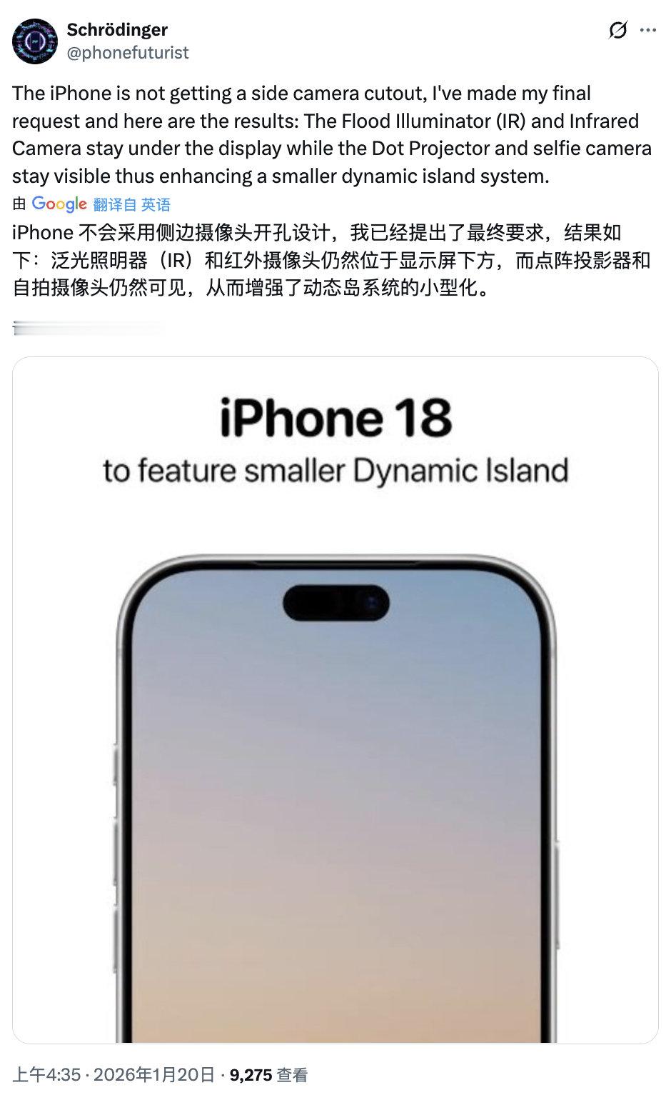 更新:iPhone 18 Pro 不会采用侧边摄像头开孔设计,只是缩小灵动岛。
