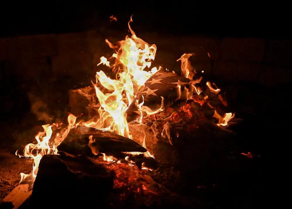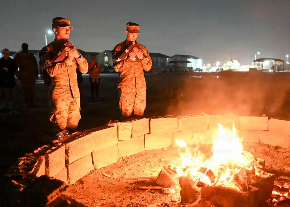 美军真狠,“退役”的美国国旗禁止它用,被立刻焚毁。 2025年1月9日,美军第380空中远征联队仪仗队员在美国中央司令部责任区内升起美国国旗。空军人员通过折叠美国旗帜、放入火中并埋葬骨灰,举行了旗帜退役仪式。