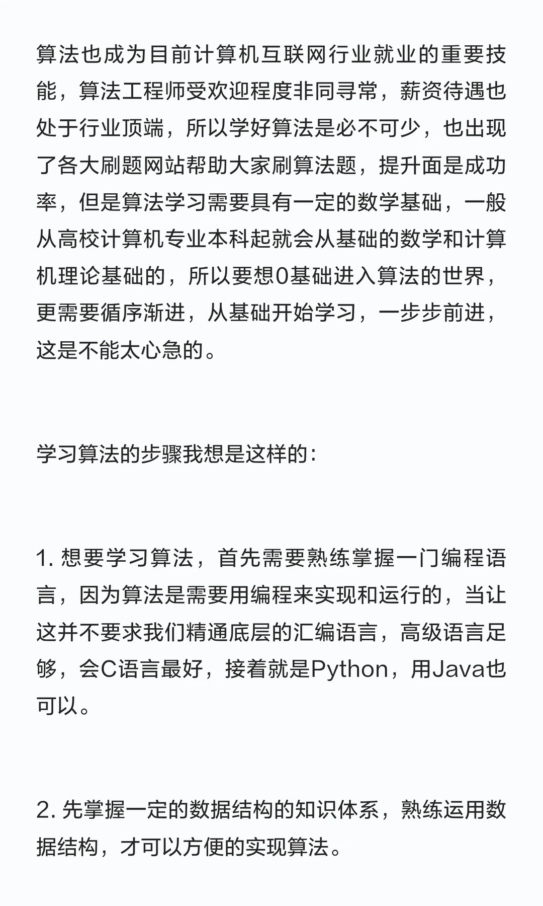 算法也成为目前计算机互联网行业就业的重要技能,算法工程师受欢迎程度非同寻常,薪资待遇也处于行业顶端,所以学好算法是必不可少,也出现了各大刷题网站帮助大家刷算法题,提升面是成功率,但是算法学习需要具有一定的数学基础,一般从高校计算机专业本科起就会从基础的数学和计算机理论基础的,所以要想0基础进入算法的世界,更需要循序渐进,从基础开始学习,一步步前进,这是不能太心急的。
