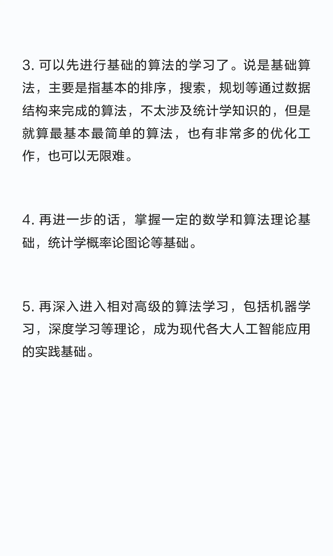 3. 可以先进行基础的算法的学习了。说是基础算法,主要是指基本的排序,搜索,规划等通过数据结构来完成的算法,不太涉及统计学知识的,但是就算最基本最简单的算法,也有非常多的优化工作,也可以无限难。