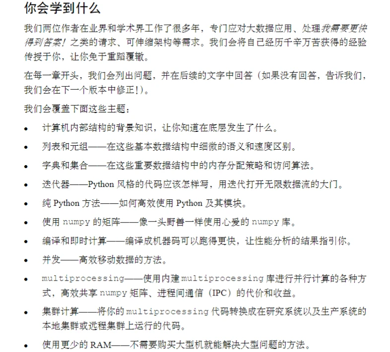 Python语言是一种脚本语言,其应用领域非常广泛,包括数据分析、自然语言处理、机器学习、科学计算、推荐系统构建等。 本书共有12章,围绕如何进行代码优化和加快实际应用的运行速度进行详细讲解。本书主要包含以下主题:计算机内部结构的背景知识、列表和元组、字典和集合、迭代器和生成器、矩阵和矢量计算、并发、集群和工作队列等。最后,通过一系列真实案例展现了在应用场景中需要注意的问题。 本书适合初级和中级Python程序员、有一定Python语言基础想要得到进阶和提高的读者阅读。