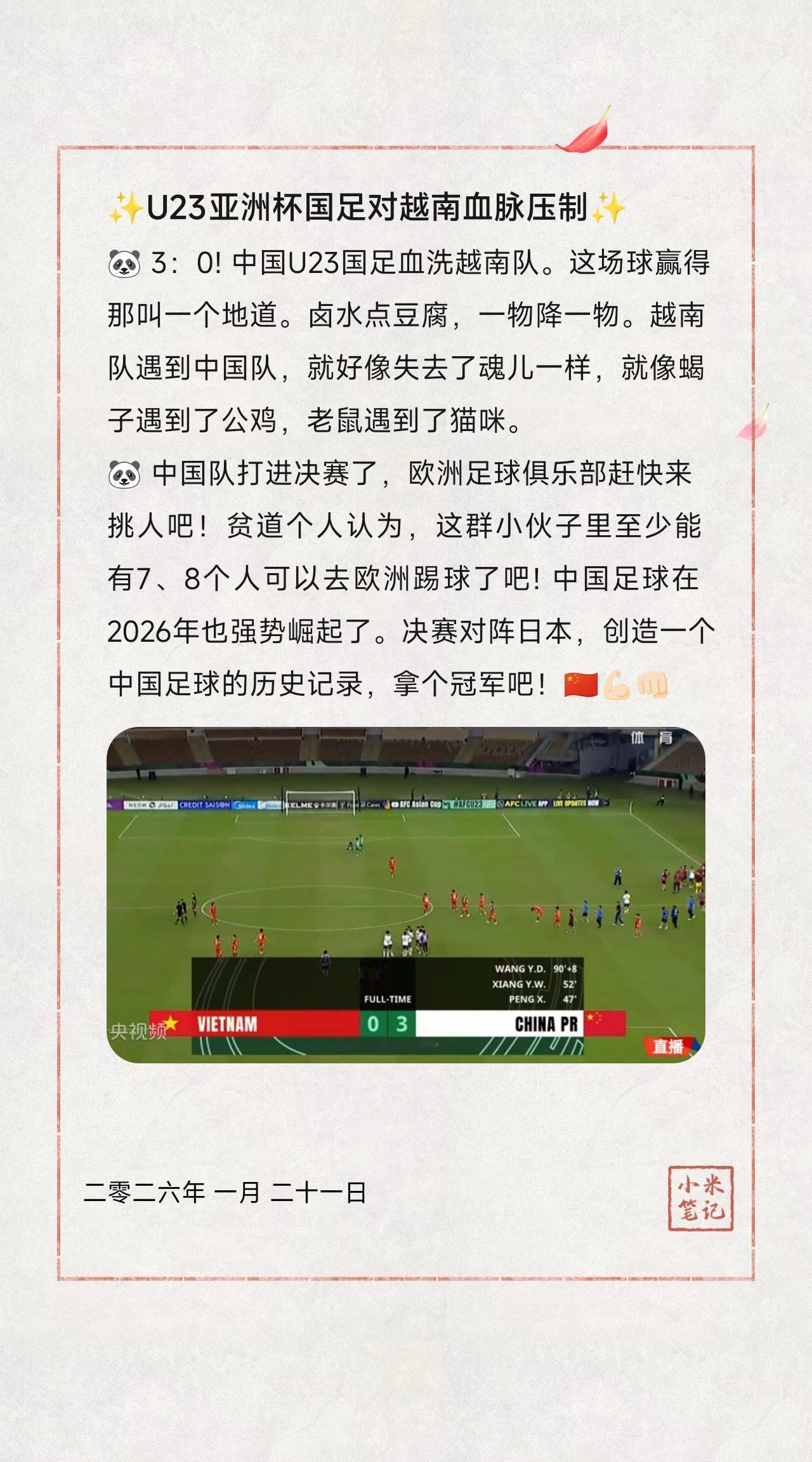 🐼 3:0! 中国U23国足血洗越南队。这场球赢得那叫一个地道。卤水点豆腐,一物降一物。越南队遇到中国队,就好像失去了魂儿一样,就像蝎子遇到了公鸡,老鼠遇到了猫咪。 🐼 中国队打进决赛了,欧洲足球俱乐部赶快来挑人吧!贫道个人认为,这群小伙子里至少能有7、8个人可以去欧洲踢球了吧! 中国足球在2026年也强势崛起了。决赛对阵日本,创造一个中国足球的历史记录,拿个冠军吧!🇨🇳💪🏻👊🏻 —— 贫道建议,有实力的企业,给U23国足悬赏1亿冠军奖金! 中国足球的春天来了! 我们是亚洲强队! 作者:龙须面🧐