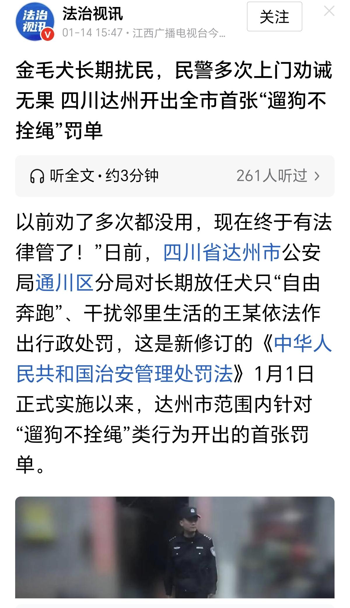 罚款都是轻的!在居民小区里散养金毛,这还了得?还不听劝,如今被开了罚单。新规发挥作用了,这是当地的头一单。 四川达州这位养狗的业主比较有代表性。 他领养了一只金毛。 金毛确实挺可爱,也比较温顺,但毕竟是大型犬只,遛狗必须要拴绳。 然而,就像不少不文明的养狗的人一样,这位业主表示,他的金毛温顺,不咬人,所以他就在小区里放养。 这些人总是习惯性地自说自话,罔顾事实,从不为他人考虑。 他养的狗,当然他不怕,但小区里有老人和孩子,金毛那么大,横冲直撞,这还行? 就算它没有恶意,但它也不能拿捏分寸,就算不咬人,也挺吓人的。 这不能责怪狗,养狗的人应该承担相应责任。 邻居有意见,他不顾,工作人员警告,他不听。 还好新规出台了,于是,台州首张罚单就开给了他。 只要有法可依,问题就比较简单了,坚持“执法必严,违法必究”,很快就会有成效的。 各位觉得呢?