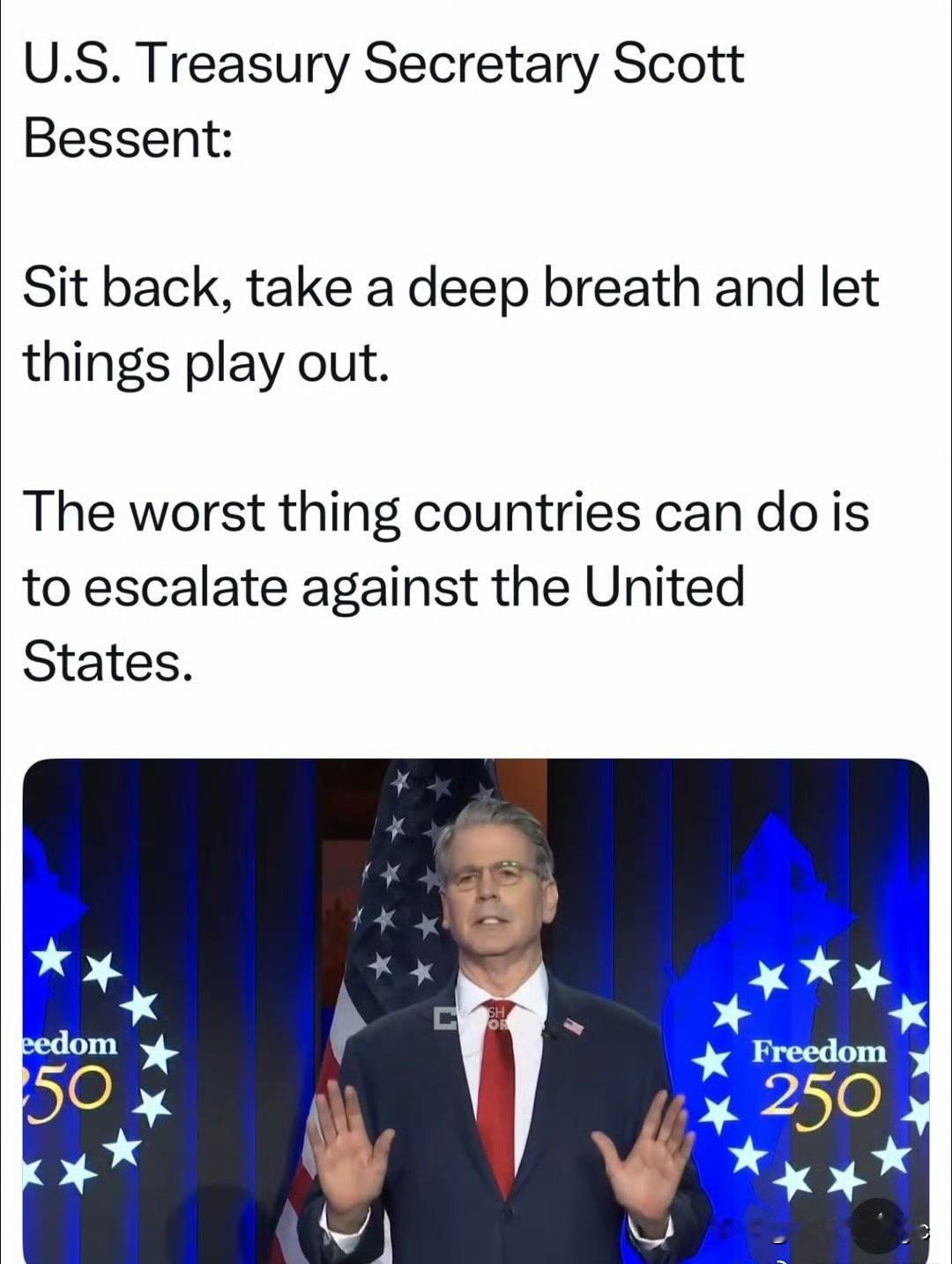 欧盟在讨论,以撕毁贸易协议的形式,反对美国总统在格陵兰问题发出的关税威胁 美国财长贝森特出来灭火:大家都冷静一下、静观事态发展…对美国施压、升级事态,是最糟的做法…各国都应该遵守我们已经谈好的协议 ​​​。 欧盟制定并即将出台三项反制措施:贸易核选项与时间表 930亿欧元报复性关税清单 精准打击美国关键产业:清单涵盖农产品(大豆、牛肉)、飞机、汽车、科技产品等高价值商品,总额相当于美国对欧年出口的18%。 自动生效机制:若2月1日美国关税如期实施,欧盟反制将于2月6日自动生效;若美国6月提升税率至25%,欧盟可能同步升级报复。 首次启用“反胁迫工具”(ACI) 限制市场准入:法国总统马克龙力推此机制,可限制美国企业进入欧盟市场,阻止美资银行参与公共采购,并对谷歌、Meta等科技巨头实施运营管制。 若美欧未能在2月6日前达成协议,欧盟报复性措施可能自动生效。尽管双方均保留外交空间,但此次争端被视为数十年来跨大西洋关系最严重的危机之一。 贝森特的表态,虽然看似强硬,细品却有劝和或色厉内荏的味道。