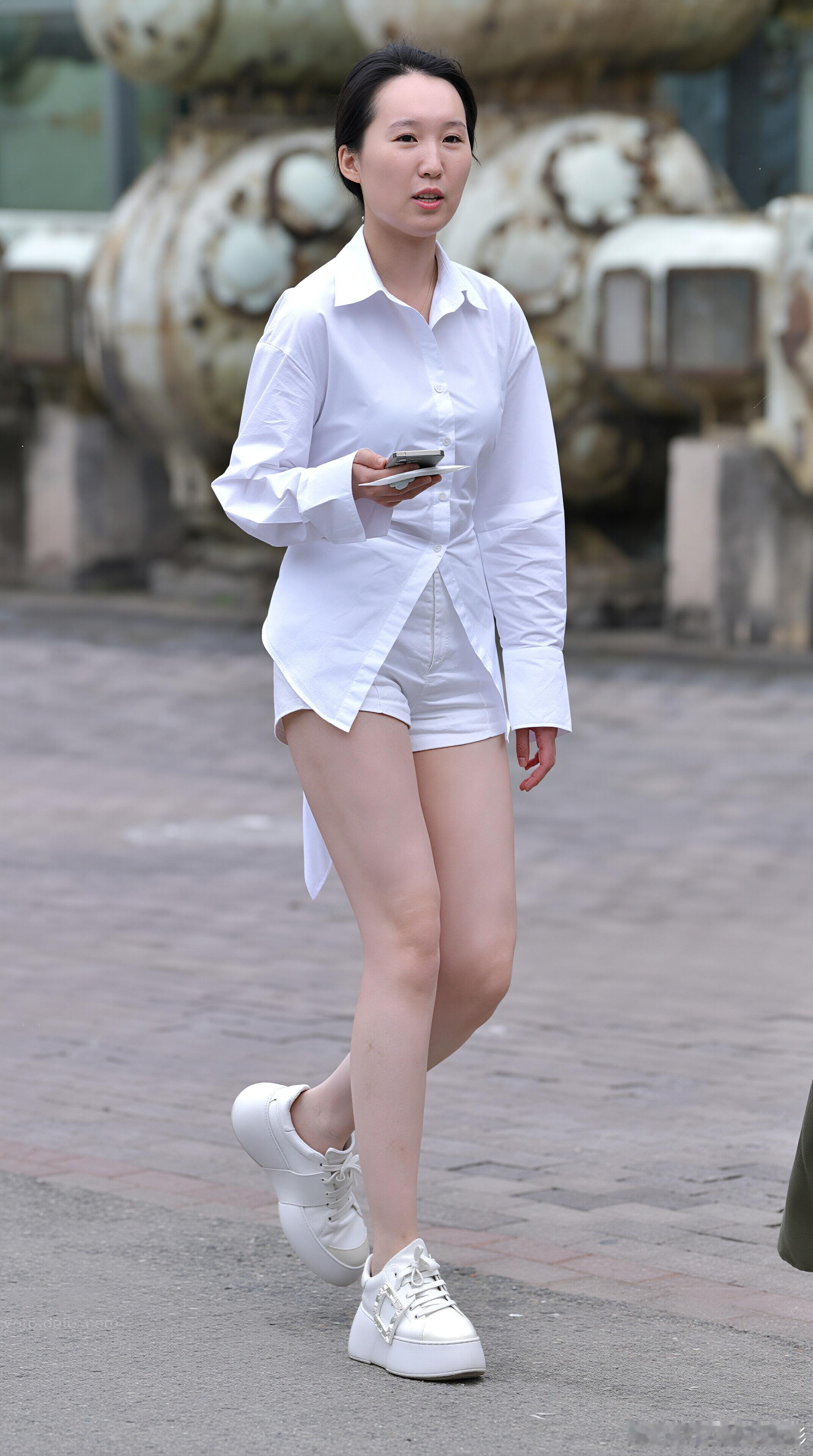全白穿搭清爽简约,宽松衬衫配短裤尽显休闲随性,厚底小白鞋拉长腿部线条,夏日出街清爽又吸睛。发现你的魅力简约穿搭