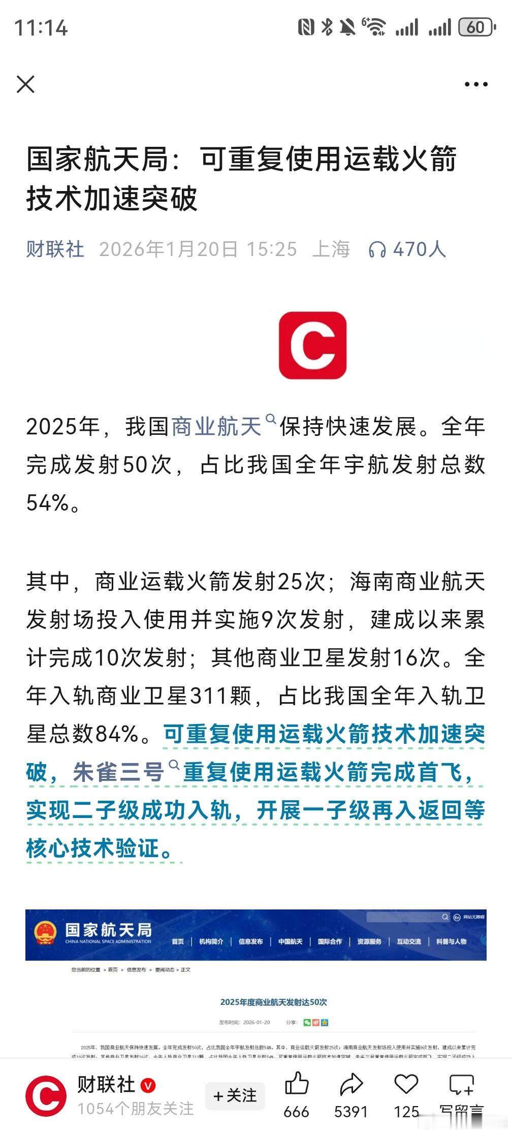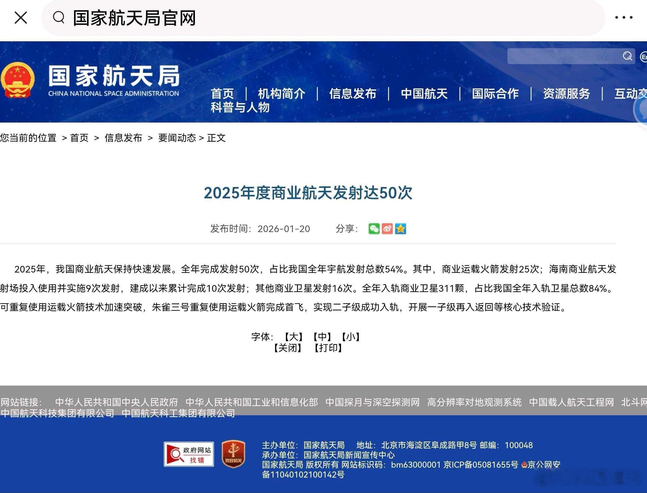 利好不断2025年,我国商业航天保持快速发展。全年完成发射50次,占比我国全年宇航发射总数54%。其中,商业运载火箭发射25次;海南商业航天发射场投入使用并实施9次发射,建成以来累计完成10次发射;其他商业卫星发射16次。全年入轨商业卫星311颗,占比我国全年入轨卫星总数84%。可重复使用运载火箭技术加速突破,朱雀三号重复使用运载火箭完成首飞,实现二子级成功入轨,开展一子级再入返回等核心技术验证。