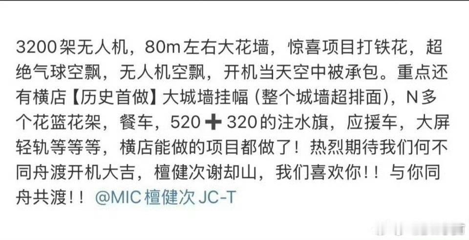 檀健次何不同舟渡横店应援 檀健次谢却山 檀健次古装权谋剧《何不同舟渡》于横店25日开机应援,3200架无人机表演 ……啊啊啊!!好盛大壮观的场面啊!小炭火🔥的爱意太盛大了!横店的夜即将为檀健次点亮!! 超级期待25日和檀健次横店应援的多见一次,一起见证小炭火🔥对大哥檀健次满满的爱意!热烈期待《何不同舟渡》开机大吉,檀健次谢却山,我们喜欢你!期待与你早日相见!