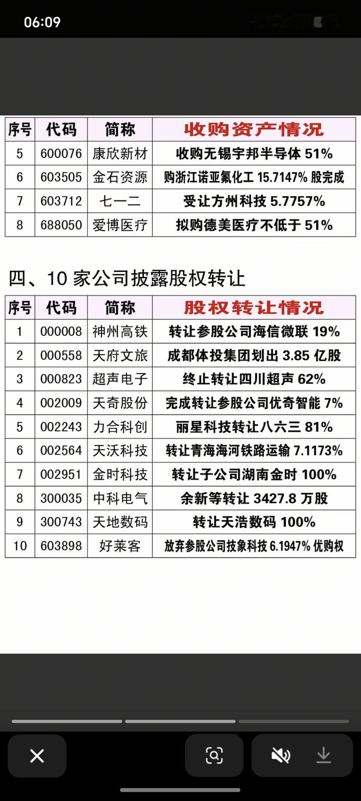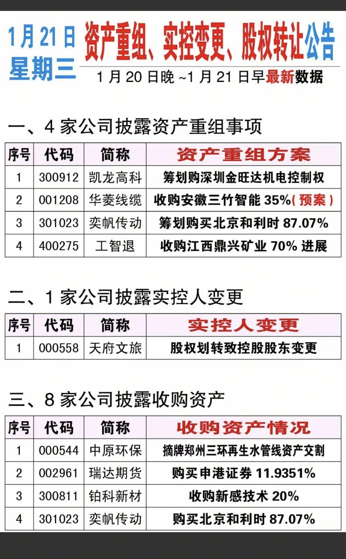 1.21周三 最新:资产重组,实控人变更,股权转让公告! 4家公司资产重组,1家实控人拟变更,8家收购资产,10家股权转让公告