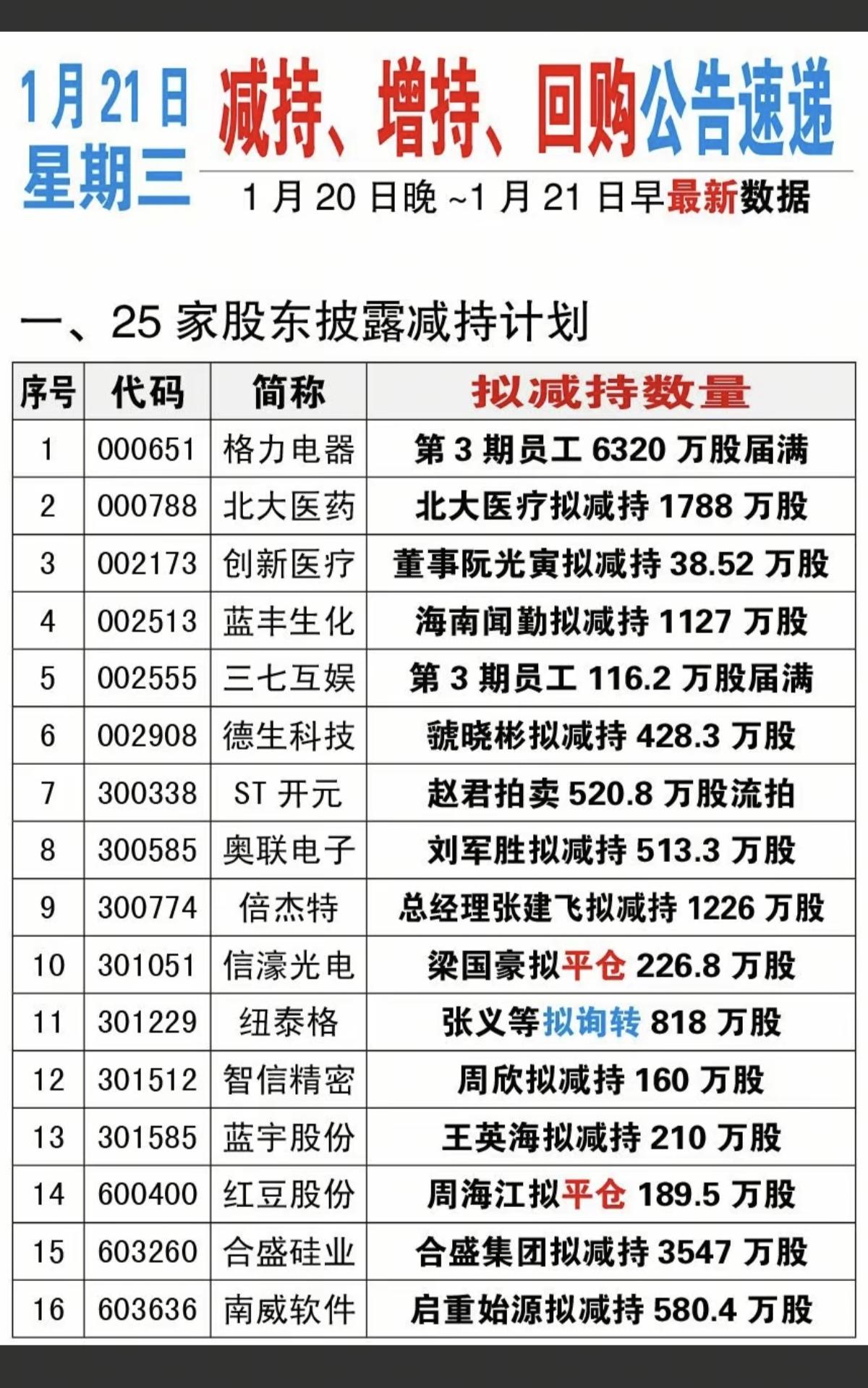 1.21周三 最新:减持,增持,回购公告 25家公司披露减持计划,30家公司公告已减持进展,2家公司披露增持计划,5家公司公告法拍股份,2家法拍股份,5家注销回购股份