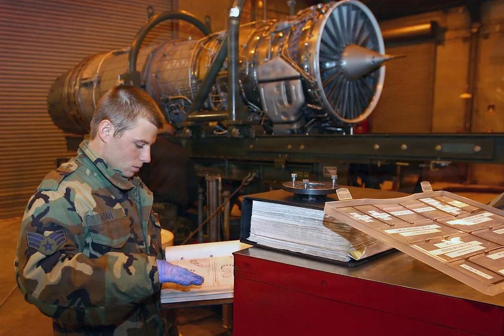 一台军用飞机发动机的说明书就像一本“砖头”手册。 2024年2月14日,新泽西空军国民警卫队第177战斗机联队的喷气发动机机械师,美国空军高级空军一等兵拉塞尔·瑞安,在新泽西州大西洋城空军国民警卫队基地核查普惠F-100 220发动机的技术订单。第177战斗机联队位于大西洋城空军国民警卫队基地。