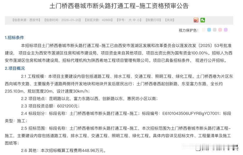 西安莲湖区传来好消息!这条断头路要打通,惠及周边居民出行 城市里的“断头路”就像交通网络的“肠梗阻”,不仅绕路还堵心!最新消息,土门桥西巷城市断头路打通工程-施工资格预审公告,周边居民盼来出行新便利 项目位于昆明路以北、富力东路以西区域,西起创新路东至富力东路,全长约235米,规划宽度20米,设计时速30km/h,作为片区东西向城市支路,建成后将重点服务两侧待开发地块及居民日常出行。总投资602.12万元,概算工程费用448.96万元,建设内容涵盖道路、排水、交通、照明、绿化五大工程,既通路网也优环境。 断头路打通不仅能疏通区域交通“毛细血管”,还能为片区发展注入新活力,期待工程早日开工,让居民告别绕行烦恼。 西安城建 莲湖民生 断头路打通