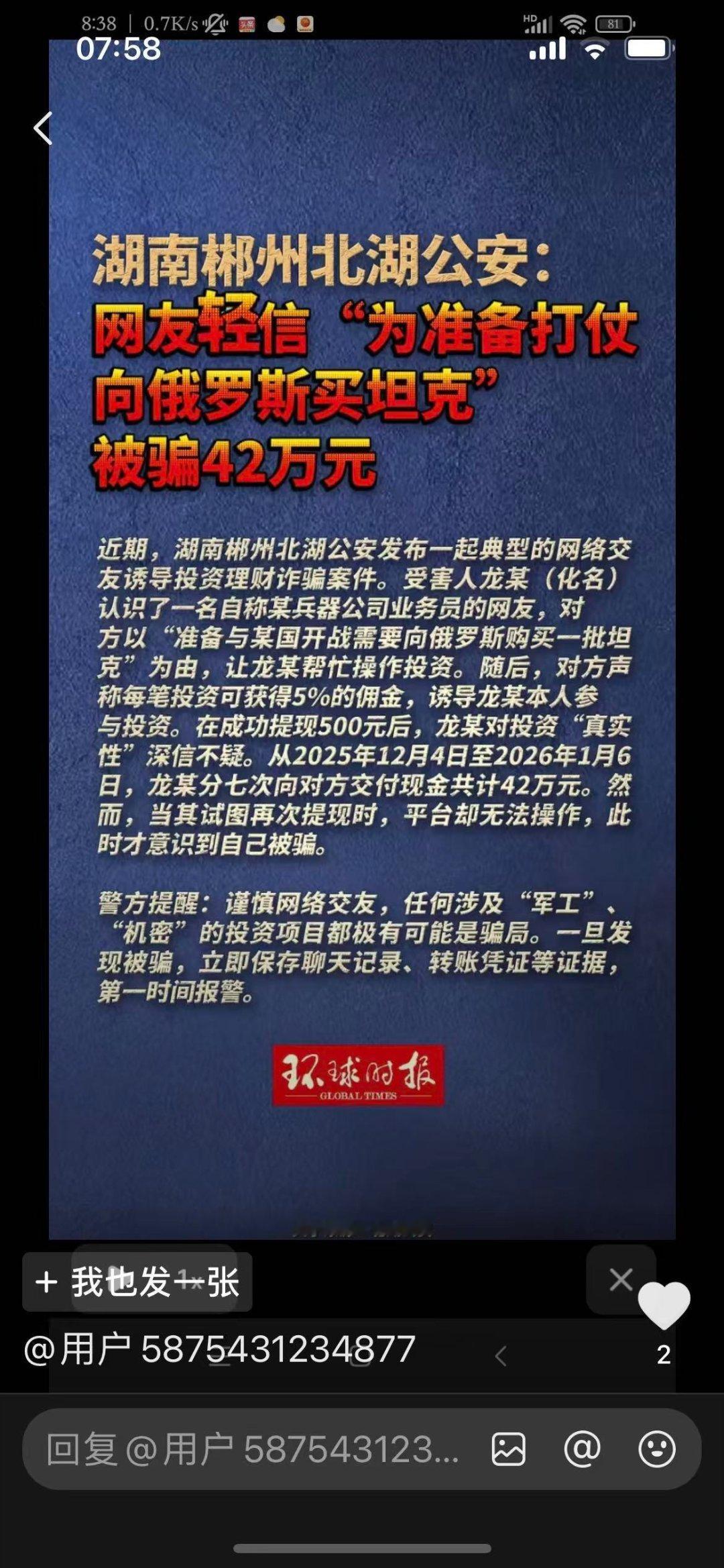 看图说话 【智商与财富严重不匹配 】湖南郴州北湖公安: 网友轻信"为准备打仗向俄罗斯买坦克"被骗42万元。看图说话