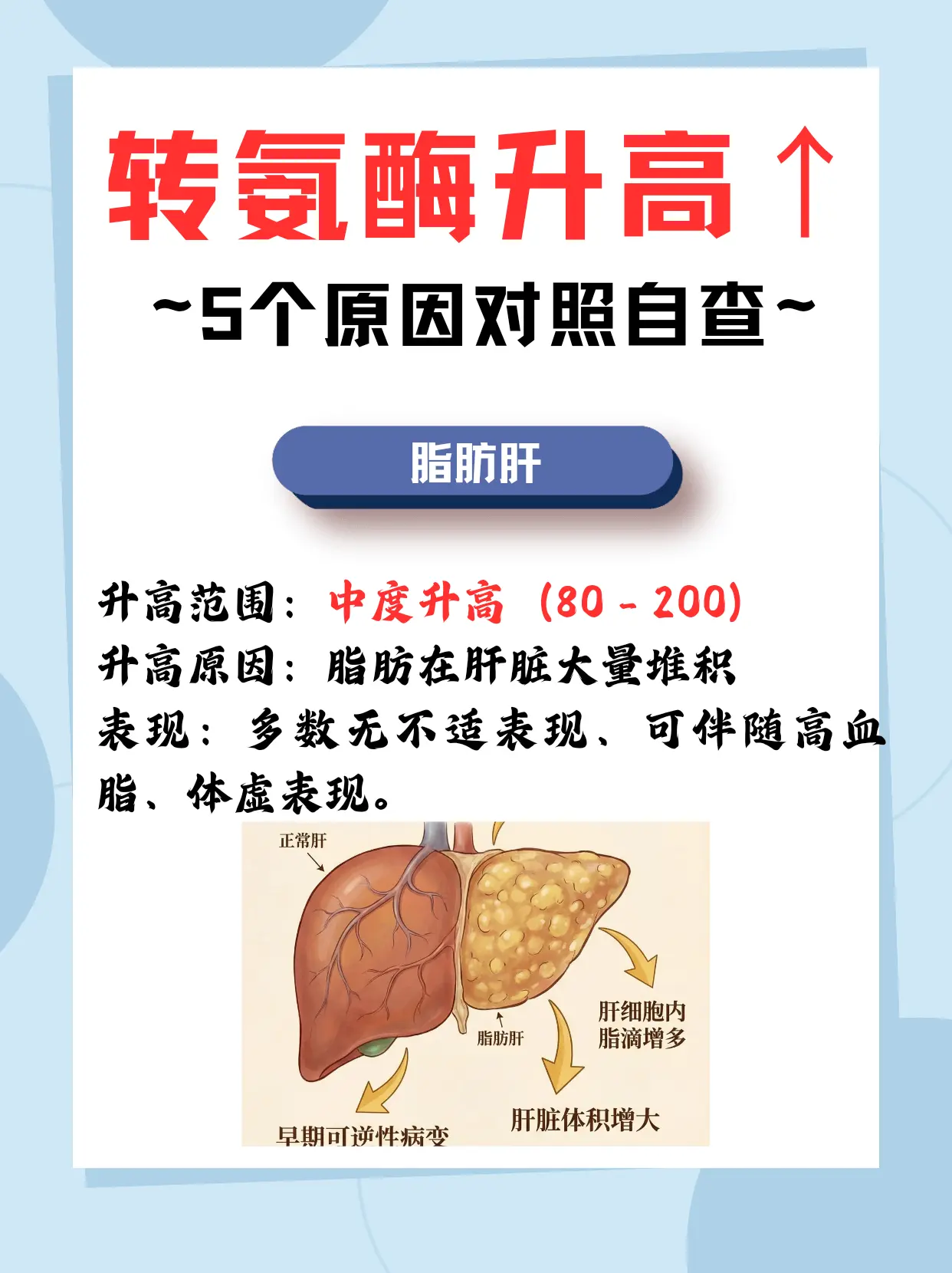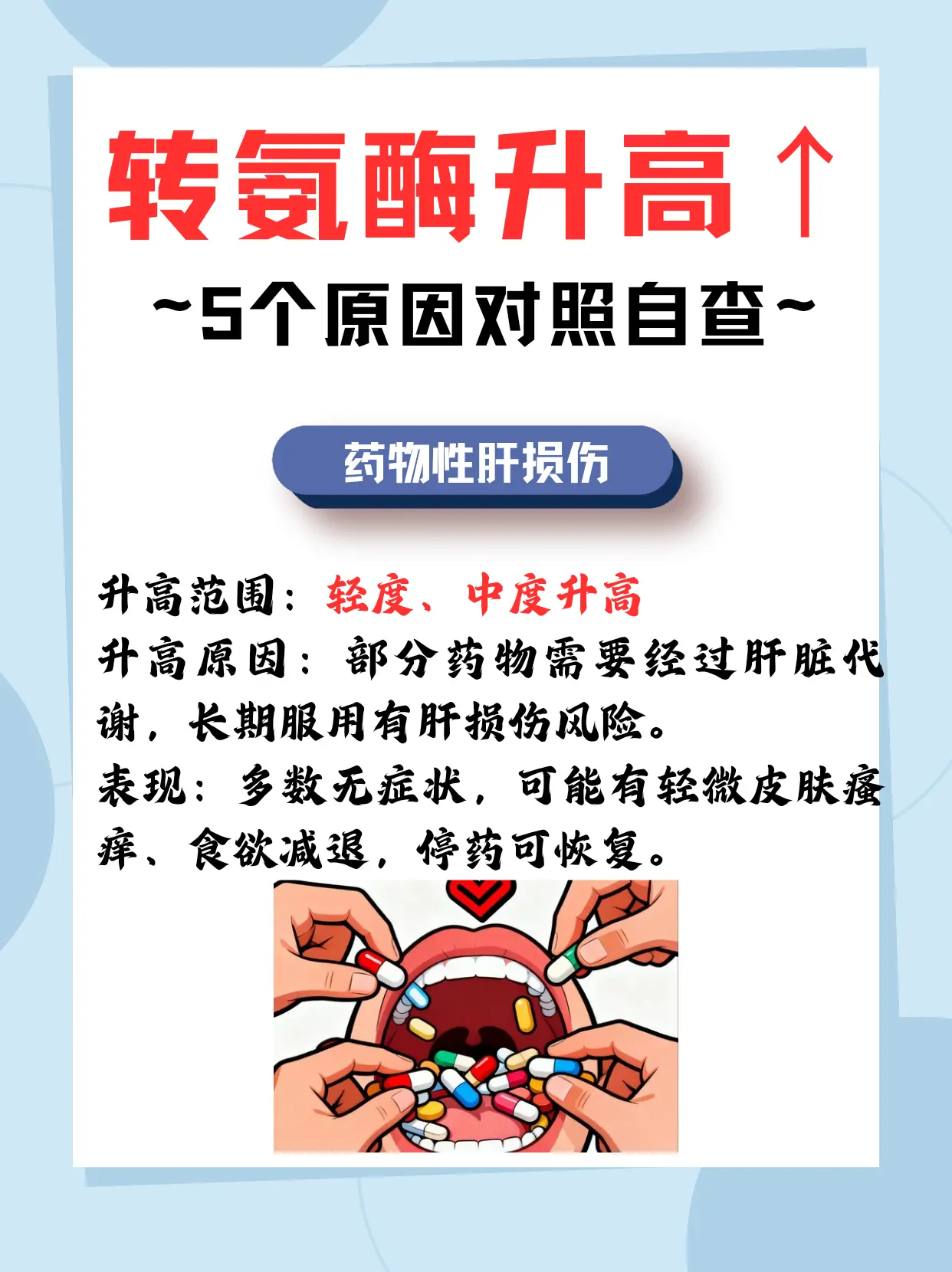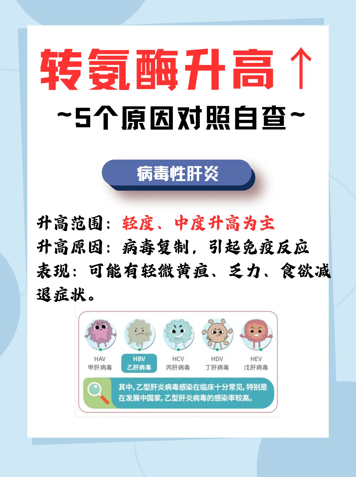 转氨酶升高,这5个原因请自查。医学科普 仅供参考。门诊个例,建议线下就医。图片中展示为小概率事件,如有指标异常,病因请以实际检查结果为准。