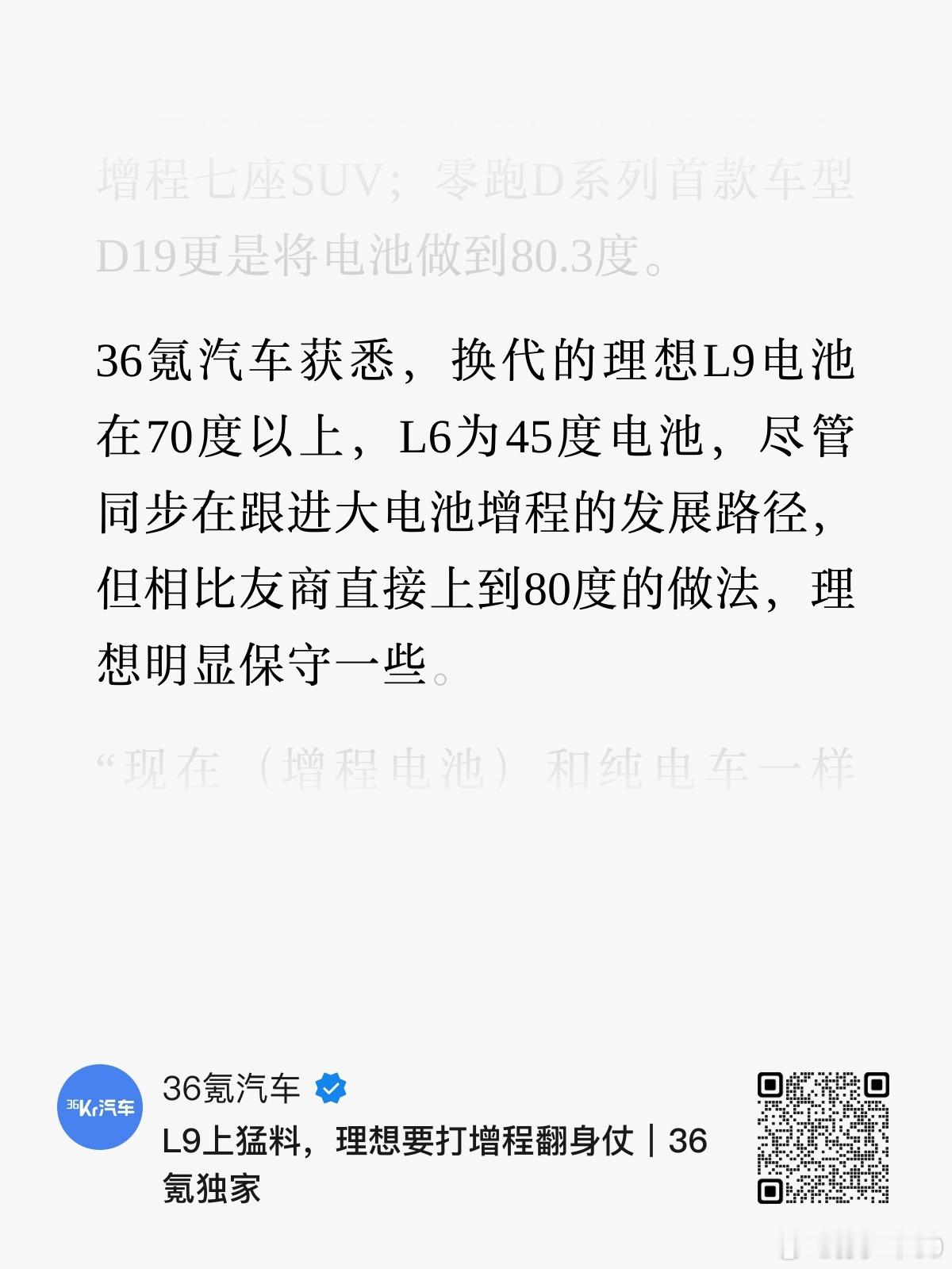 36氪汽车获悉,换代的理想L9电池在70度以上,L6为45度电池,尽管同步在跟进