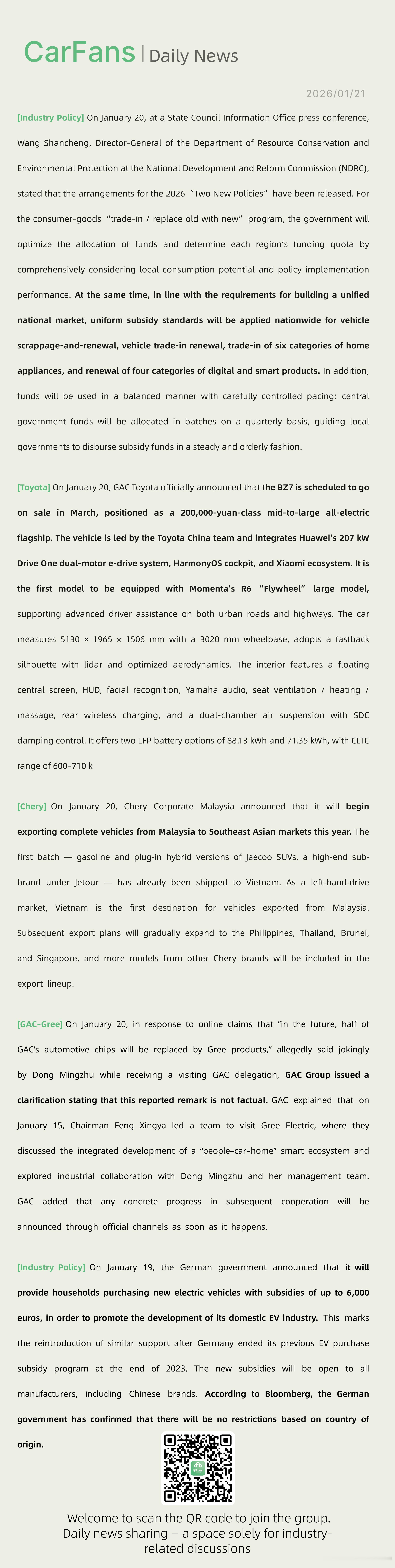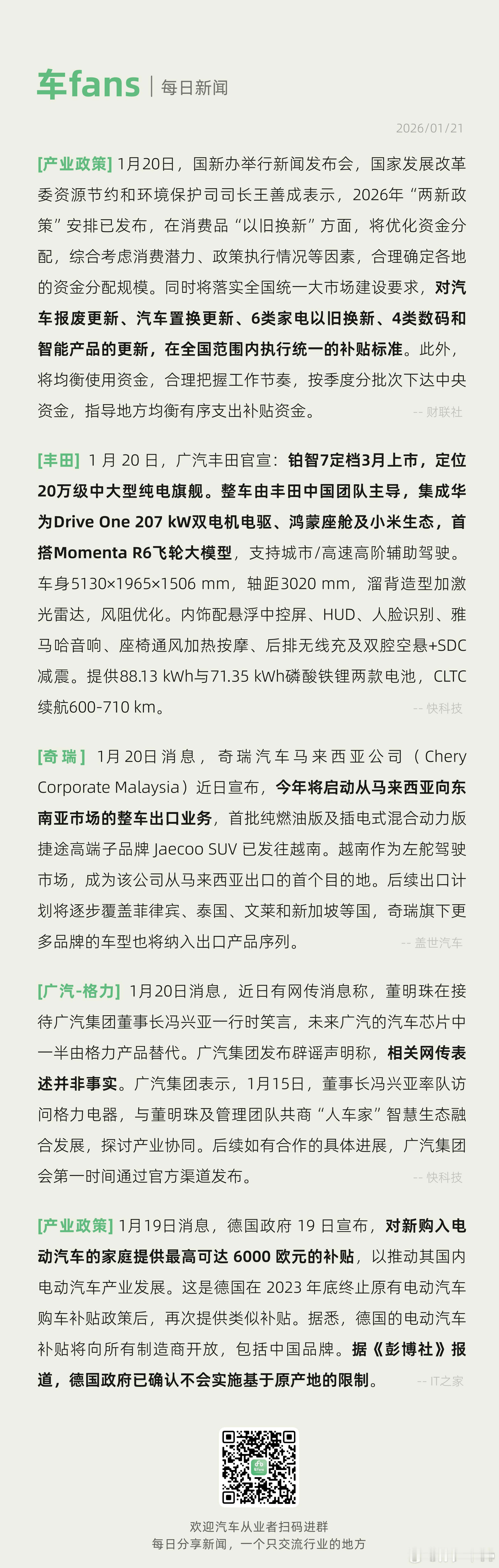 广汽丰田官宣铂智7定档3月上市、奇瑞今年将启动从马来西亚向东南亚市场的整车出口业务广汽丰田官宣:铂智7定档3月上市,定位20万级中大型纯电旗舰。整车由丰田中国团队主导,集成华为Drive One 207kw双电机电驱、鸿蒙座舱及小米生态,首搭Momenta R6飞轮大模型,支持城市/高速高阶辅助驾驶。车身5130x1965x1506mm,轴距3020mm,溜背造型加激光雷达,风阻优化。内饰配悬浮中控屏、HUD、人脸识别、雅马哈音响、座椅通风加热按摩、后排无线充及双腔空悬+SDC减震。提供88.13kWh与71.35kWh磷酸铁锂两款电池,CLTC续航600-710km。华为小米全上车了新能源汽车