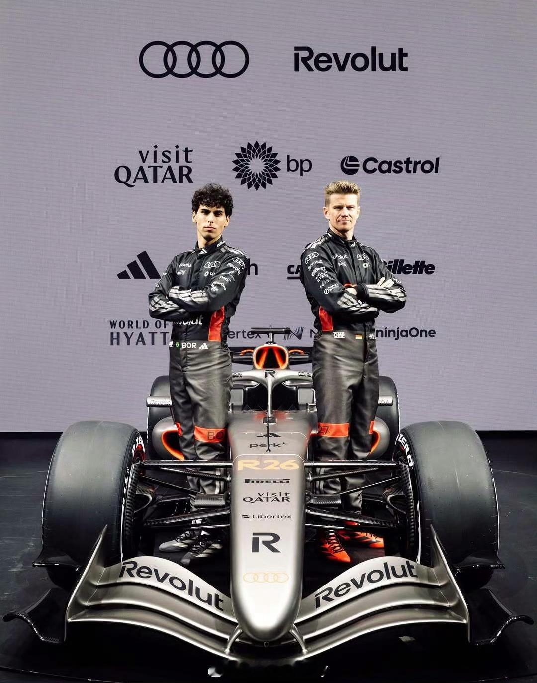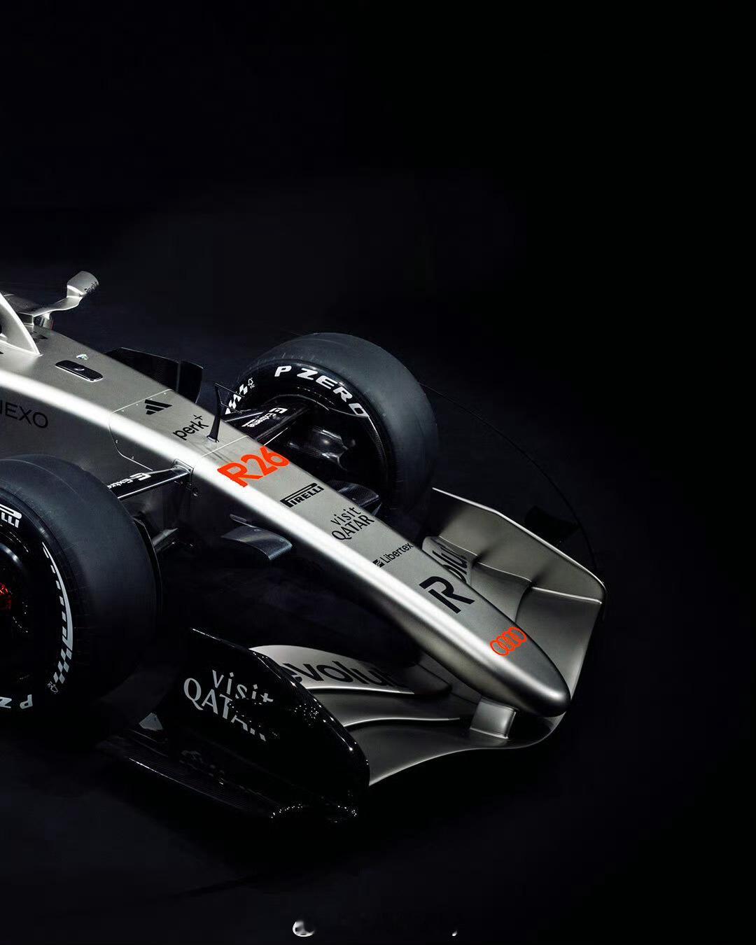 奥迪 2026 赛季新车R26涂装发布完毕没想到还真是之前车队发布会上那银/橙两大主打色没啥变化主要是把赞助商加上了你别说全是大牌👏👏👏2026f1新车发布奥迪
