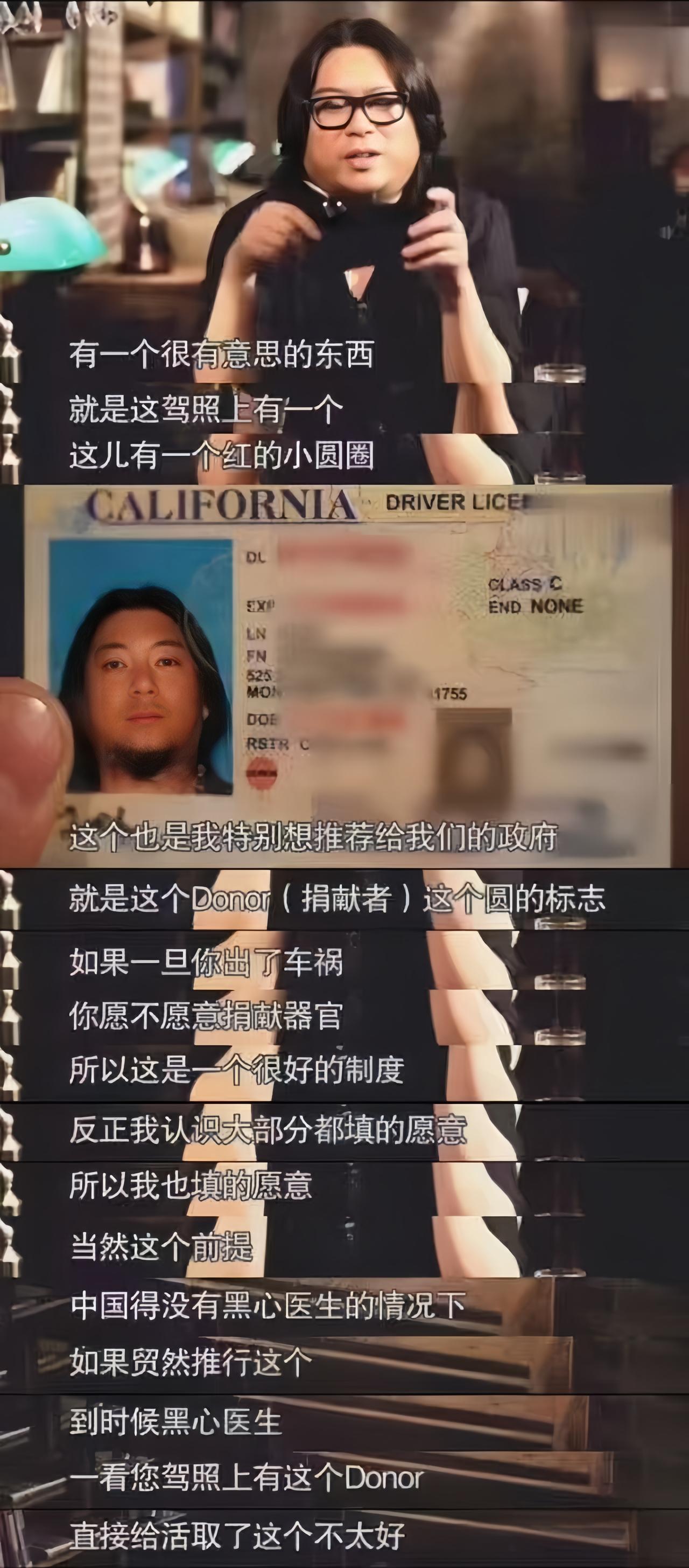 牢A与公知对待同一件事的不同解读: 牢A:奉劝各位出国的人,千万不要点美国驾照上的“器官捐献选项”,一旦勾选了同意,你就有可能从路人变成了待分配的资源,万一你遇见车祸昏迷了,可能就“被捐献”了。 矮大紧:美国驾照上有一个小红圈,你勾选了就代表愿意捐献器官,我认识的人都填的愿意,我也填的愿意。这是个非常好的制度,我特别想把它推荐给我们的政府。 矮大紧说这话大概是在2012年,牢A是2026年,短短十几年,真是沧海桑田,换了人间啊!