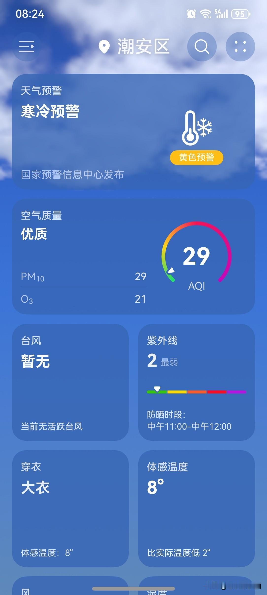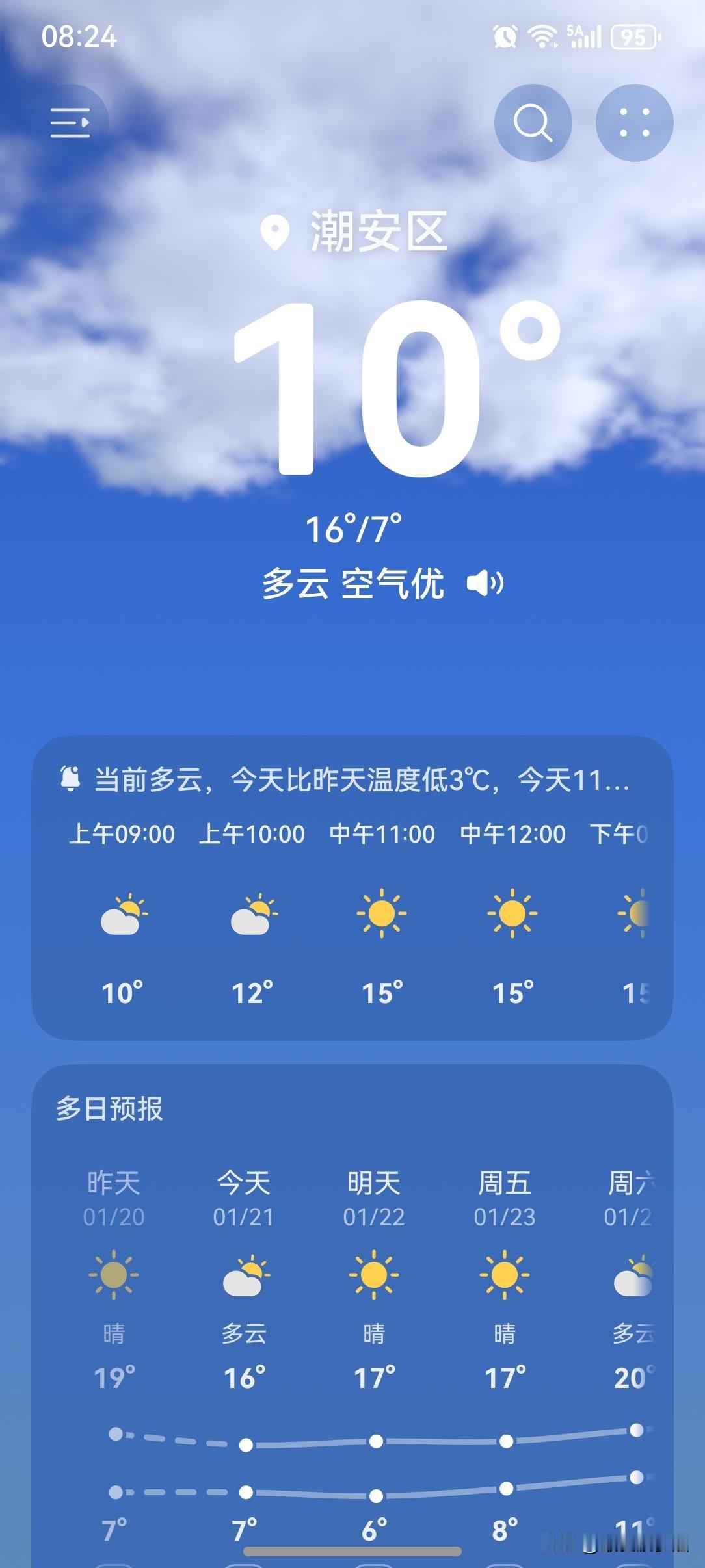 全国多地降雪寒潮来袭,冷空气经过长途跋涉,翻山越岭之后,终究还是来了!广东即将从暖粒粒切换到冷冰冰,广州最低7℃,多区已发布寒冷预警,广州上一次下雪还是10年前。 21~23日,较强冷空气持续影响广东,粤北有大范围5°℃以下低温,粤北高海拔山区﹣4~0℃,有冰冻。21~22日,我省大部多云到阴天,韶关、清远北部有分散小雨,高海拔山区有雨夹雪或冻雨,其余市县多云到阴天。 今天(21日),潮州喜提一个多云天气,气温7~16℃,此刻气温10℃,体感温度8℃。 一起来看看今天的天空吧!云量增多了,厚重的云层覆盖范围大增,看不到一丝阳光。 没有了阳光的加持,早上的气温又下降了不少,再加上那不要钱北风呼啸而来,感觉寒冷又增添了几分。 今天的天气总结为以下十六字:“云量大增,不见阳光,气温骤降,体感寒冷。” 这天气达不到好评了,只能差评了哈! 如此天气!元芳,你怎么看? [我想静静][捂脸][我想静静][捂脸][我想静静][捂脸][我想静静][捂脸]