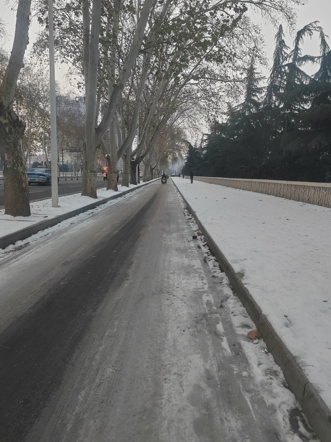 看来这中兴路非机动车道上的冰与雪,只能靠太阳的热度来融化了! 前天的一场雪,让中小学的学生们在家待了一天半。今天一大早,学生和送孩子们上学的家长,便开始利用各种交通工具奔赴在上学的路上了。 中兴路,作为一条市区的主要道路,平常还能看到路上有老头儿和老太们在扫扫树叶、捡捡垃圾、扫扫地什么的。但面对这一场不期而至的雪,显然再让这些上了年纪的老人去处理,就让他(她)们有些力不从心了,不但是因为年龄,有些老人走路都不利索,你再让他(她)去清理积雪和路面上的冰层,一不小心摔着了,那又是一笔不小的开支。 看来中兴路上的这雪、这冰,也只能是路人小心再小心,也只能等待太阳公公把热量洒到上面,让它慢慢融化了!