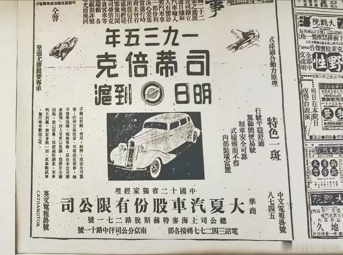 民国大夏汽车公司的进口斯蒂庞克广告车价美金1375元起