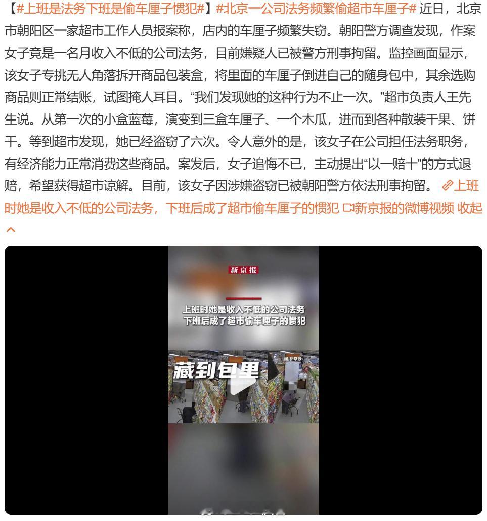 上班是法务下班是偷车厘子惯犯此人作为司法系统从业者却多次盗窃,是典型的“知法犯法”。其行为已非单纯泄压,更透露出对规则的挑衅与对“掌控感”的病态迷恋——白天维护秩序,夜晚则通过破坏秩序来确认自己的“特权”与“能力”,沉浸于这种危险的身份反转游戏中。从火中取栗到玩火自焚。