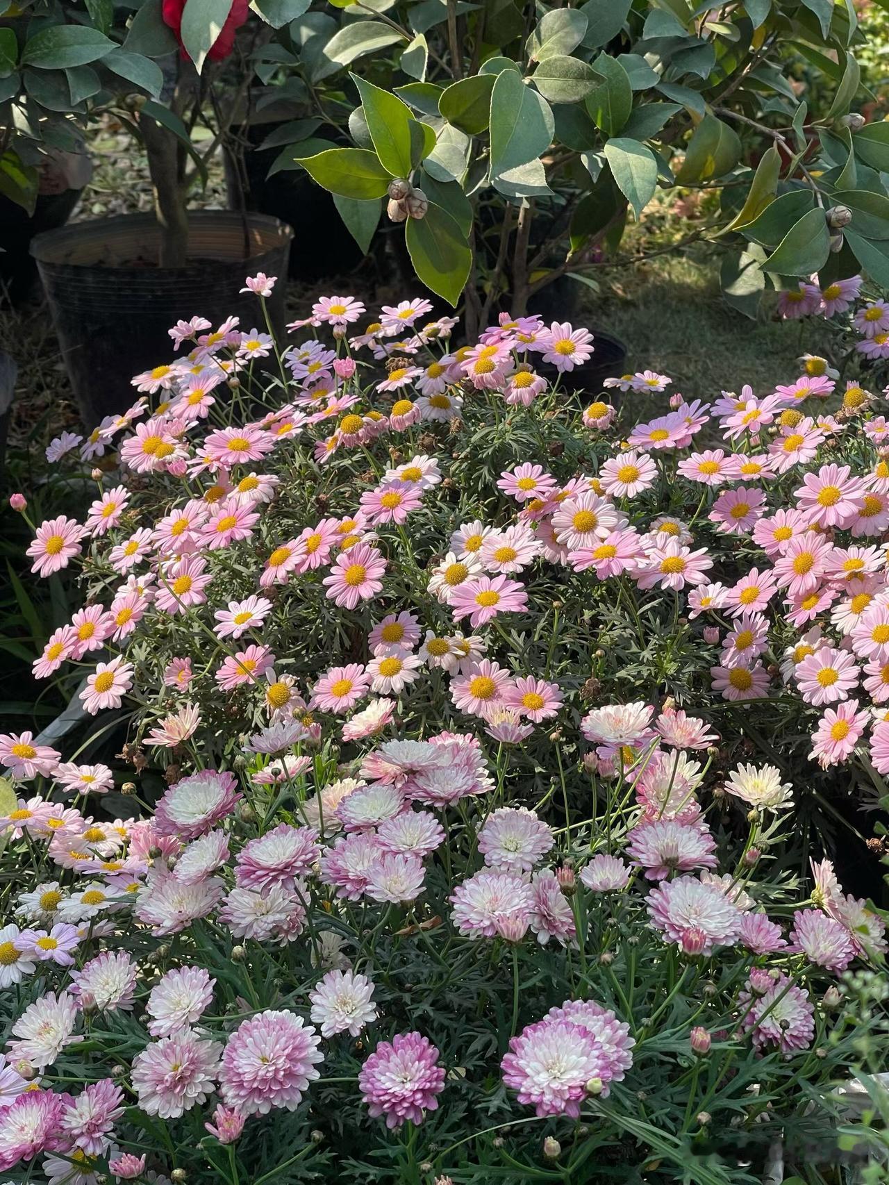 今早晨跑回来,路过公园转角,突然被一片粉粉白白的花团给绊住了脚。 走近一看,一大丛玛格丽特开得热热闹闹,有粉色有白色,层层叠叠挤在一起,迎着太阳笑得特别灿烂。 本来跑完步还有点累,看着这满眼花,瞬间就觉得心里敞亮又舒服。赶紧拍了张照,就想把这份热闹又温柔的好心情,也存下来。