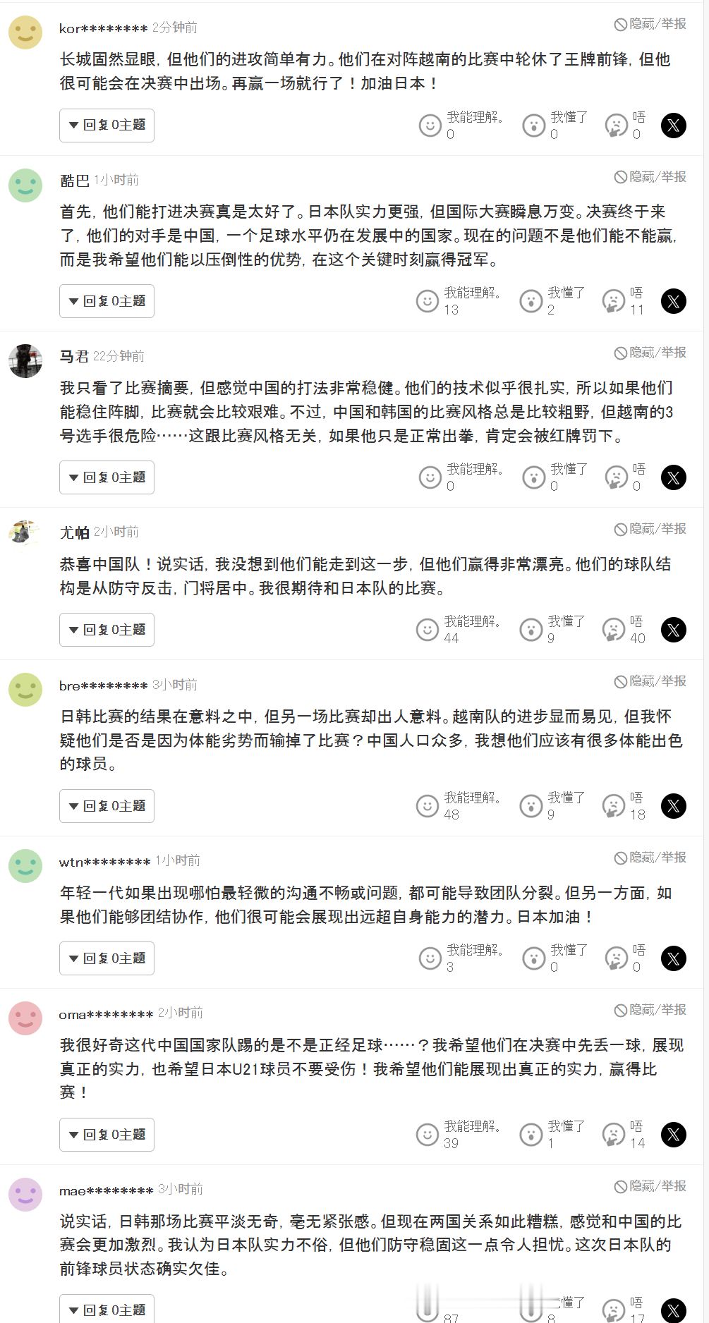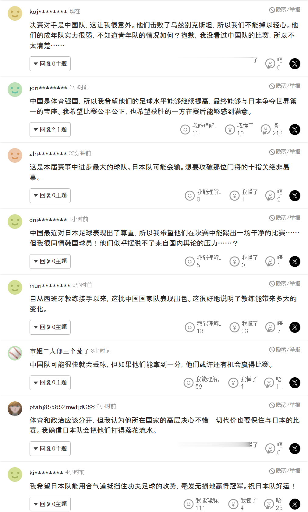 虎扑01月21日讯昨晚U23亚洲杯两场半决赛战罢,决赛将由中国队对阵日本队。在得知决赛对阵中国队后,日本网友发表了诸多评论,部分摘录如下: