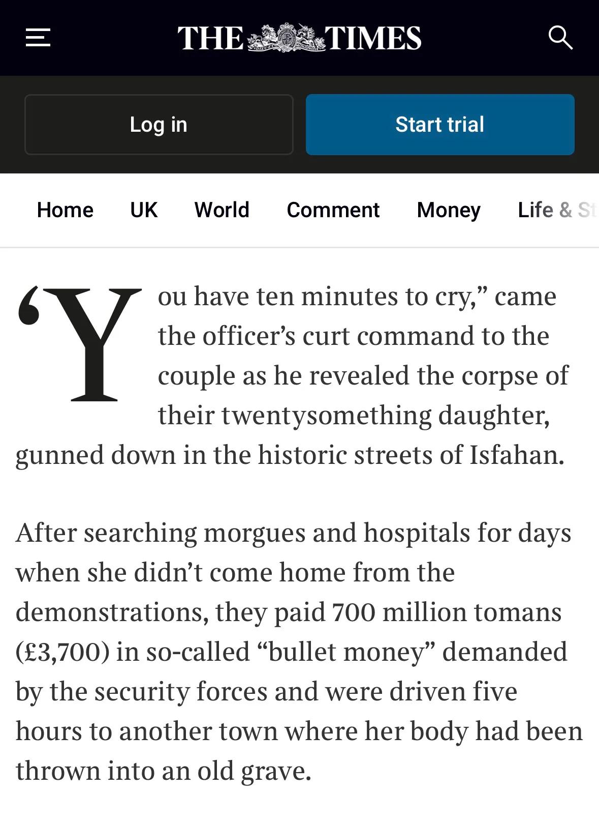 英国的《星期日泰晤士报》报导:在伊朗的伊斯法罕,一对父母在停尸房里找到了女儿,她身上有多个弹孔。当他们悲痛欲绝想要把遗体领回家安葬的时候,负责看管的伊斯兰革命卫队军官冷冷地对他们说:“你们有十分钟的时间哭泣。” 然后,这名军官开出了一张“子弹费”账单。 军官说:“你们的女儿是暴徒,是我们用了子弹才把她消灭的。这子弹是国家财产,你们必须赔偿。” 这笔子弹费是7亿里亚尔,按照黑市汇率,大概相当于3700英镑。 有些过份了,如果这不是英国媒体造谣。
