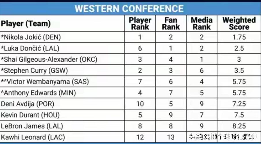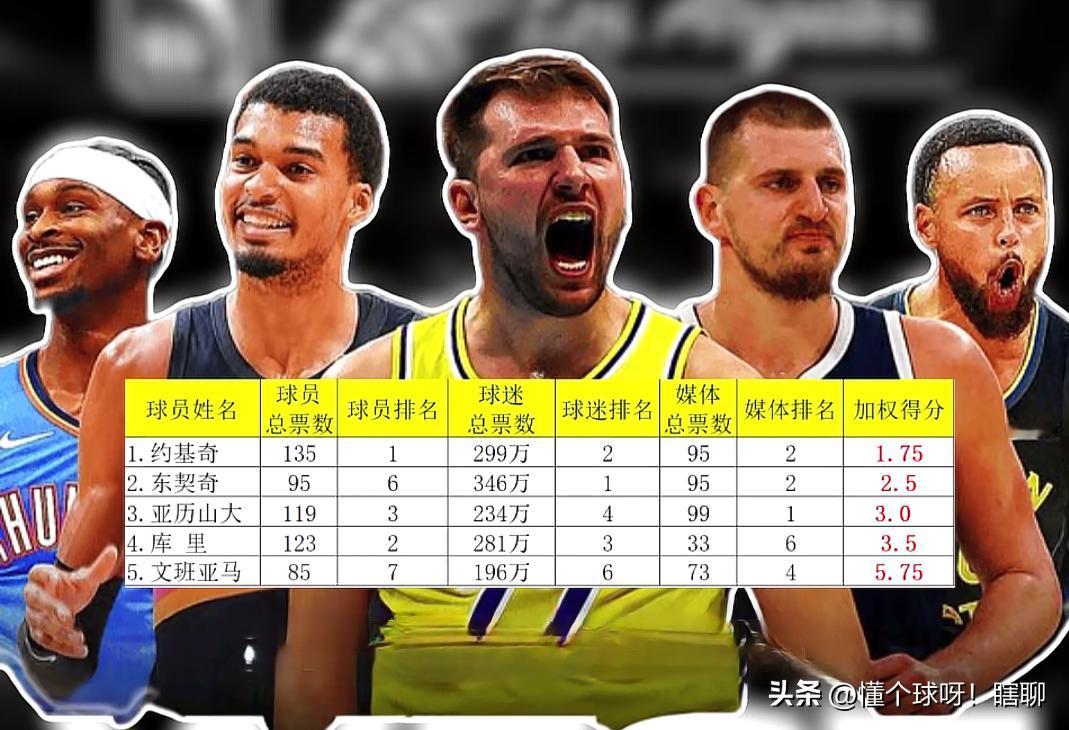 东契奇的球迷是不是都是斯洛文尼亚的 他哪里来的这么多球迷 他这个西部票王有没有水分,约基奇更值得 在球员心中都不太认可东契奇,他只排在第六 仅仅只有96票,约基奇135,第二的库里123 在球员心中约基奇,库里这样的球员才值得肯定 其中SGA媒体投票是99票没有意外的第一 库里成了鲜明的对比只有33票排在第6️⃣ 媒体这是有多不待见库里,真是想不明白 詹姆斯这一次确实不行了,球员跟球迷投票 都只排在第9,就连媒体也只有第9了 看了这个投票详情球迷总结一下,怎么来形容今年的全明星