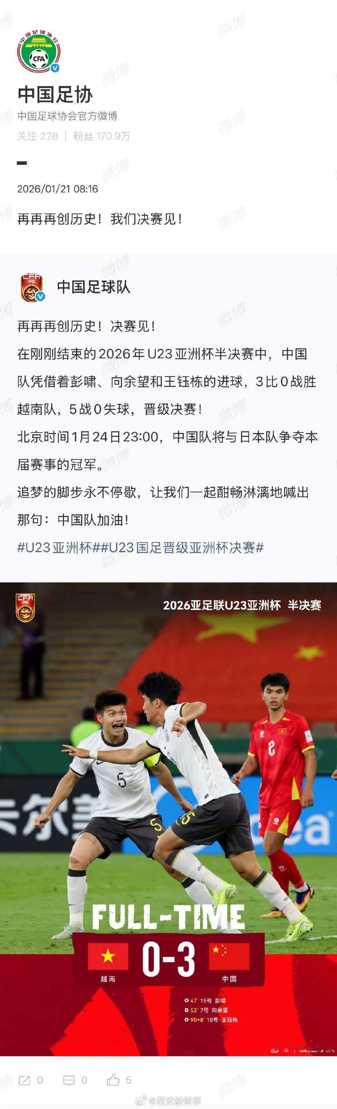 【中国足协回应U23国足晋级决赛】中国足协祝贺U23国足进决赛2026年U23亚洲杯半决赛中,中国队凭借着彭啸、向余望和王钰栋的进球,3比0战胜越南队晋级决赛。北京时间1月24日23:00,中国队将与日本队争夺本届赛事的冠军。刚刚,发文祝贺:“再再再创历史!我们决赛见!” U23国足3比0越南U23