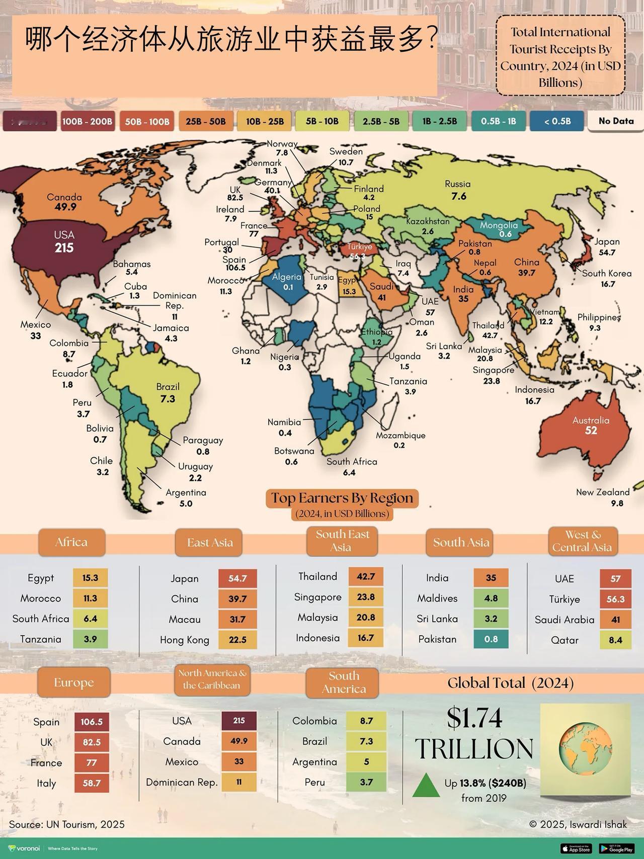 谁是从外国游客身上获得收益最多的经济体? 每年,全球旅游业都创造了数万亿美元的经济收益,因为游客们纷纷探索新的旅游目的地,同时也会重游那些他们钟爱的景点。根据联合国旅游部门的数据,2024 年国际游客收入总计达 1.74 万亿美元,较 2019 年疫情前的水平增长了 14%。 下面图表显示了这些支出对哪些经济体最为有益的,从而揭示了哪些经济体从外国游客的访问中获益最多。 不出所料,美国遥遥领先,从国际游客那里获得了 2150 亿美元的收入。欧洲占据前列位置,西班牙(1065 亿美元)、英国(825 亿美元)、法国(770 亿美元)和意大利(587 亿美元)都获得了大量的旅游收入。日本(547 亿美元)、中国(397 亿美元)和泰国(427 亿美元)则位列亚洲收入最高的国家之列。 不出所料,美国遥遥领先,从国际游客那里获得了 2150 亿美元的收入。欧洲占据前列位置,西班牙(1065 亿美元)、英国(825 亿美元)、法国(770 亿美元)和意大利(587 亿美元)都带来了大量的旅游收入。日本(547 亿美元)、中国(397 亿美元)和泰国(427 亿美元)则位列亚洲收入最高的国家之列。 ——为何一些国家的经济状况会优于其他国家? 旅游业的收入取决于多个因素:不仅包括游客的数量,还包括每位游客的消费金额。例如,美国的游客数量众多,且每位游客的平均消费额也较高。而像马尔代夫或牙买加这样的国家,其游客总数可能较少,但旅游业在该国国内生产总值中的占比却要高得多。 在欧洲,丰富的文化遗产、便捷的交通以及靠近主要市场等因素使得各国的旅游业收入大幅增长。如今,西班牙的旅游业收入甚至超过了法国,它拥有众多历史悠久的城市、美食以及丰富的文化遗产。这种多样性有助于全年吸引游客,并来自多个客源市场。因此,该国成为了 2020 年全球游客访问量最多的国家。种类极其丰富的旅游体验,包括世界级的海滩和岛屿群岛等。 ——冲突地区的旅游业:以乌克兰为例 该数据集中有一个颇为令人惊讶的数字——乌克兰的国际旅游收入达 10 亿美元。尽管战争仍在持续,但该国的一些地区,尤其是西部地区,仍相对稳定,并对人道主义、商务以及与侨民相关的旅行持开放态度。那些返回家乡探望家人的乌克兰人以及国际志愿者的消费行为,即便在特殊情况下,也与旅游业的消费情况类似。