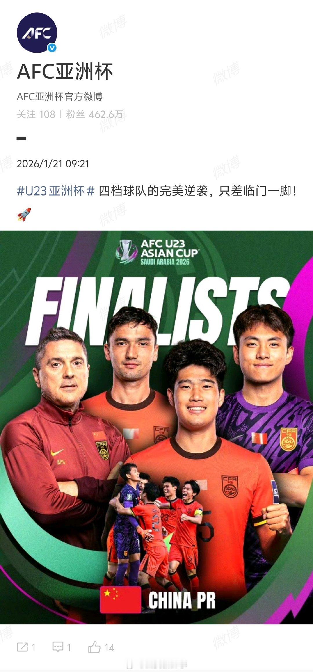【亚洲杯称U23国足完美逆袭只差临门一脚】亚洲杯祝贺U23国足U23亚洲杯半决赛,中国队3-0击败越南队,晋级决赛。中国男足U23首次打进U23亚洲杯决赛,这也是男足各级国家队时隔22年再进决赛!U23国足3比0越南U23 1月21日,官方微博晒照发文:四档球队的完美逆袭,只差临门一脚!