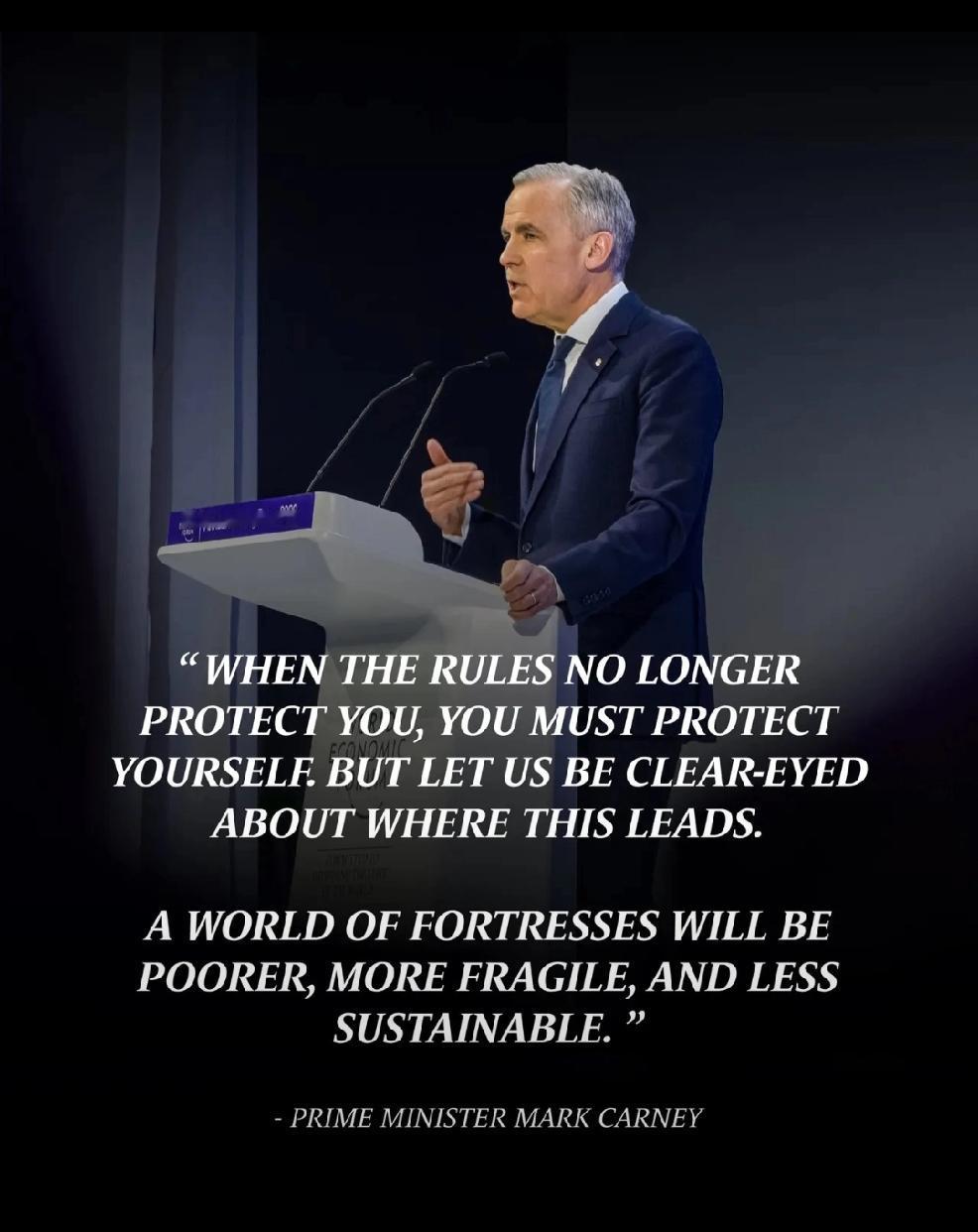 据媒体报道,1月20日,加拿大总理卡尼在瑞士达沃斯论坛上的演讲,可以说是有指南针的意义。 演讲内容简述如下:基于规则的国际秩序已经消亡,取而代之的是大国竞争时代;我们正处于断裂之中,而非过渡;中等强国必须共同行动,因为如果你不在桌子上,你就在菜单上;当规则不再保护你时,你必须保护自己。 个人认为:从中国的历史上看,这一步终于走出来了。不是加拿大总理卡尼,就会是某位欧洲国家的领导人。这是历史责任,也是历史发展的必须一步。因为这是国家求生的举措。 这也是一种进步,曾经加拿大是美国忠心耿耿,鞍前马后的小弟,这次算是一种清醒。 这对于美国是一种打击,对于美国人来说,我只不过是让你伤筋动骨,又不是让你自杀,你为何要反抗呢? 对于美国来说,这些西方盟友都是“包衣”。 包衣是中国清朝的一种奴隶制度。
