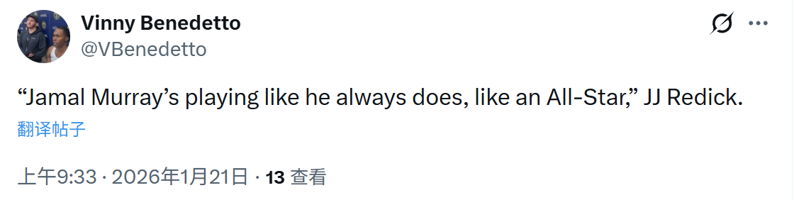 雷迪克:贾马尔·穆雷一如既往的表现出色,就像一名全明星球员。