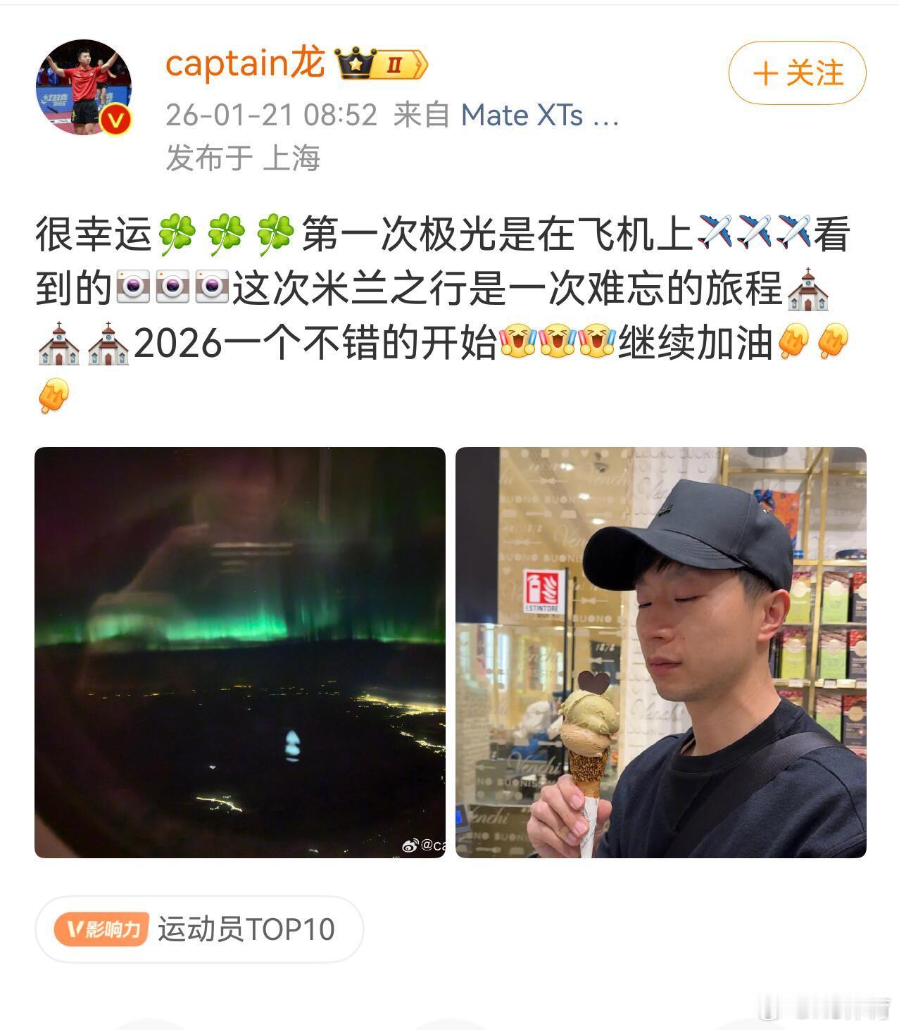 马龙在飞机上第一次看到极光于万米高空,邂逅天地奇景;在热爱之途,永驻当打之年。 ✨国乒队长分享了一段格外浪漫的旅程:他的第一次极光,竟是在飞翔的航班上捕捉到的🌌。这如梦似幻的奇遇,连同米兰之行的记忆,被他定义为 “2026一个不错的开始” 。这份感触,何其动人。它仿佛一个精妙的隐喻——最美的风景,往往奔赴在坚定的航程之中。正如龙队传奇的职业生涯,那些巅峰的荣光与闪耀的时刻,无不源于在漫长训练航线上,心怀热爱、静心耕耘的每一日。“心怀热爱,永远都是当打之年。” 这不仅是话题,更是他真实的写照。从球台到人生,热爱是唯一的永恒坐标。它让34岁的马龙依然屹立于赛场之巅,也让他能在30000英尺的高空,收获命运馈赠的璀璨光谱。全网热点共创计划