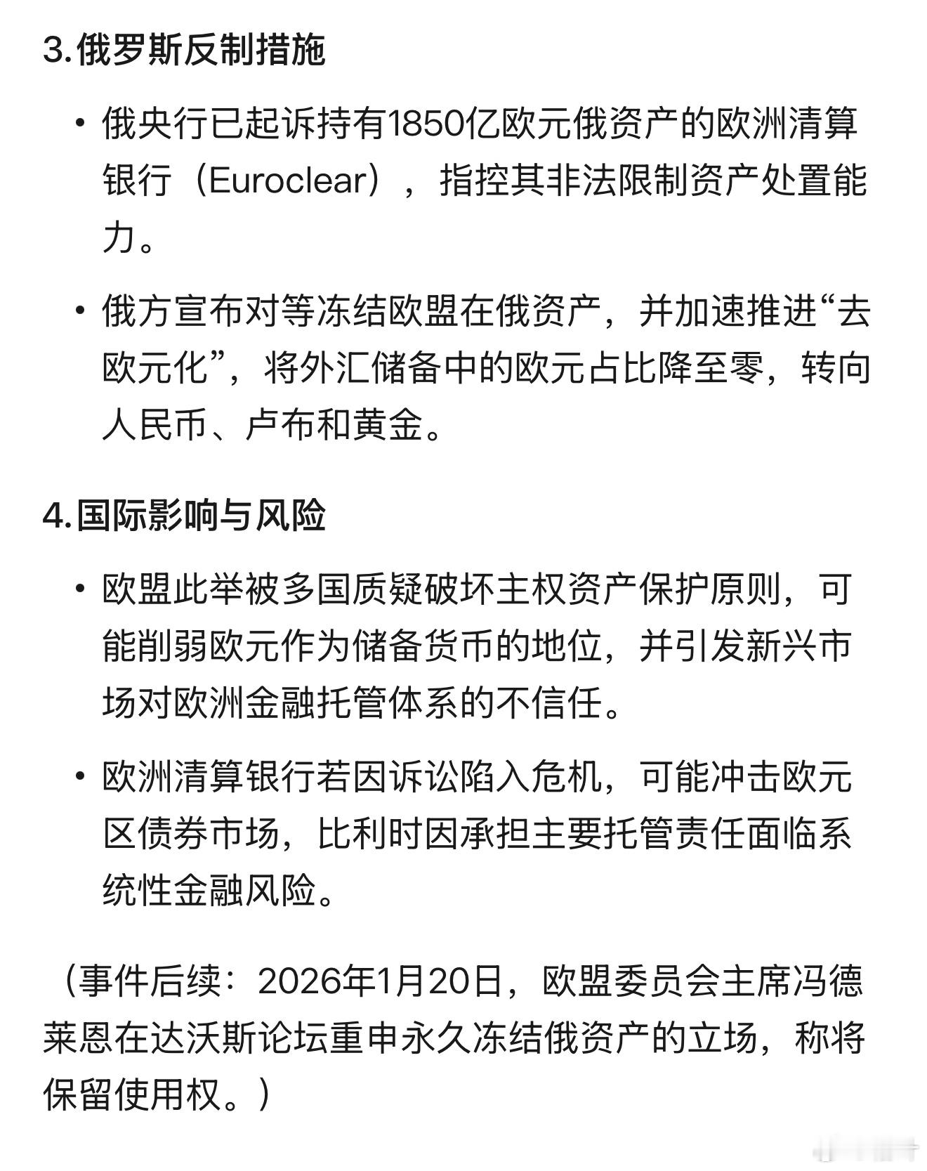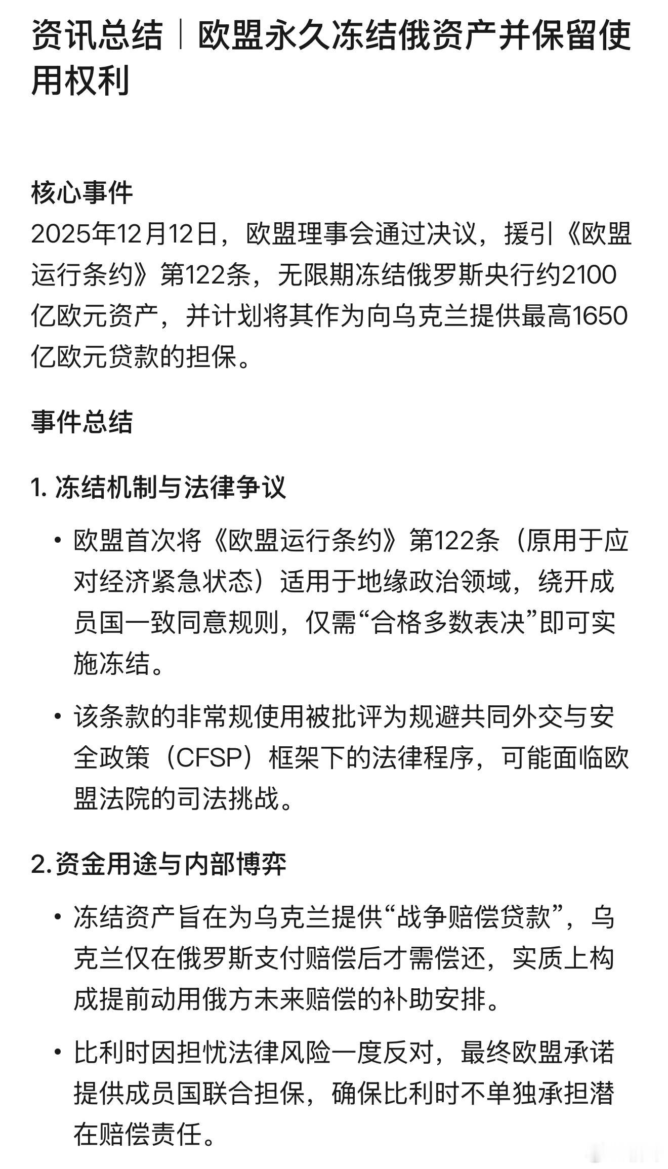 欧盟这次“永久冻结俄罗斯资产”,这是要改写金融规则啊。永久冻结等于永远消失?这是想撑住乌克兰、能压住俄罗斯?但确实让全球资本感觉更加不安全。支持大毛子不给欧洲天然气供暖,冻住欧洲
