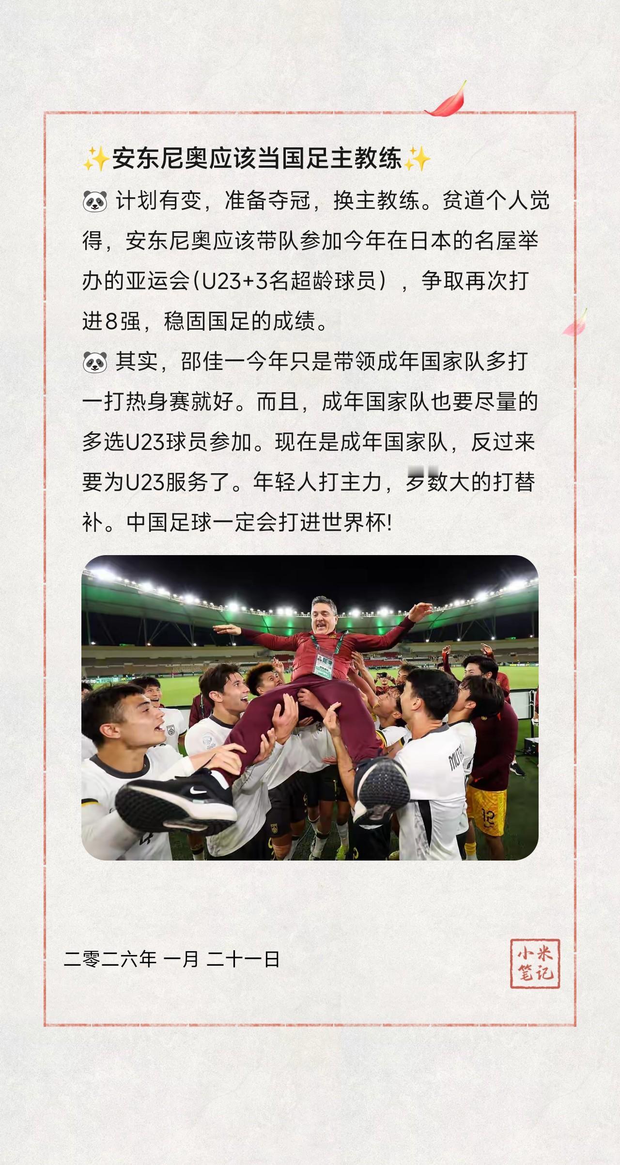 🐼 计划有变,准备夺冠,换主教练。贫道个人觉得,安东尼奥应该带队参加今年在日本的名屋举办的亚运会(U23+3名超龄球员),争取再次打进8强,稳固国足的成绩。 🐼 其实,邵佳一今年只是带领成年国家队多打一打热身赛就好。而且,成年国家队也要尽量的多选U23球员参加。现在是成年国家队,反过来要为U23服务了。年轻人打主力,岁数大的打替补。中国足球一定会打进世界杯! 作者:龙须面🧐