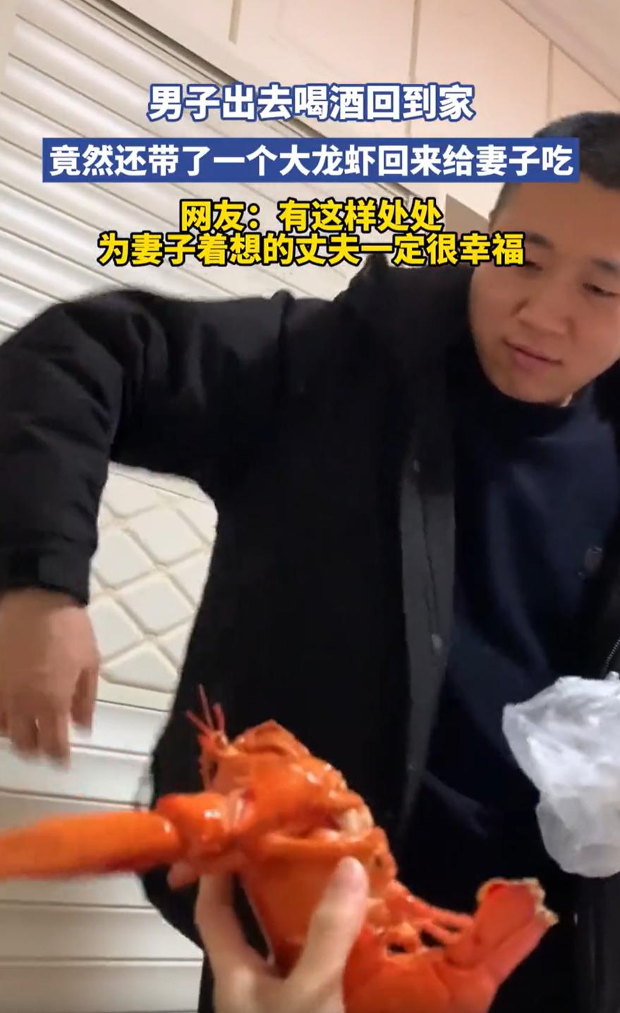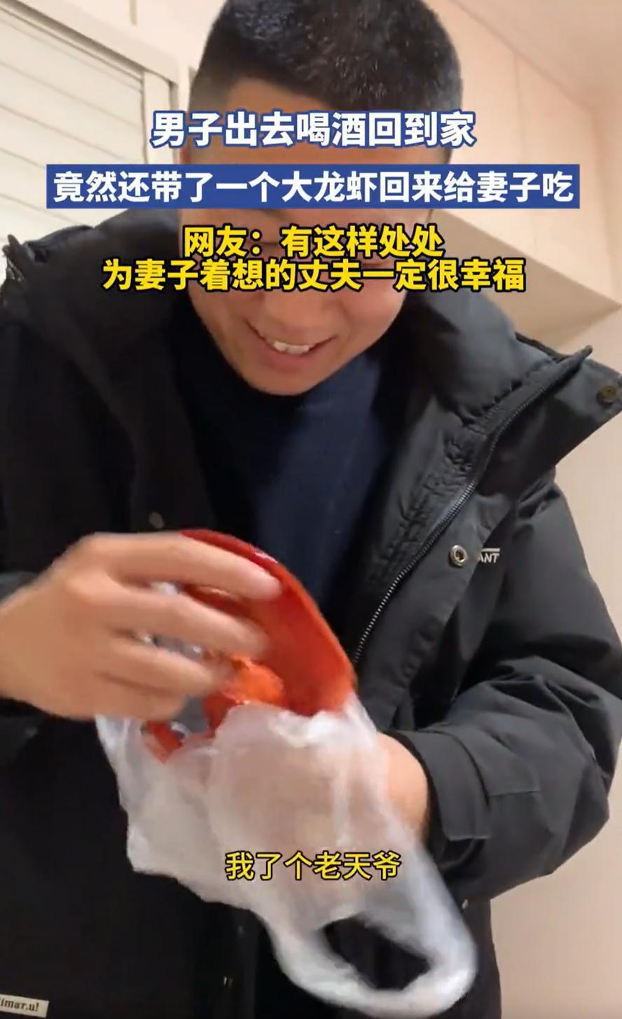 “嫁对人了!”河南,一男子和朋友出去聚会喝酒,回到家时已经比较晚了,进屋后就让躺在床上的妻子伸手,妻子已经有些不耐烦,还以为他喝多瞎胡闹,结果从兜里掏出一个大龙虾,妻子当时就懵了:我的老天爷 当天晚上,男子回到家后就直奔卧室,看到妻子躺在床上,就神神秘秘的让她伸手,妻子闻到酒味后有些不耐烦:我伸手弄啥,你有病吧你,这都几点了? 没想到,丈夫完全没在意妻子在说什么,自顾自的从兜里掏出一个塑料袋,打开后里面是一个红彤彤的大龙虾,甚至连钳子都完完整整,妻子一下子怔住了,刚才那点埋怨瞬间消散,只剩下一句带着笑意的惊呼:我的老天爷,你喝蒙啦 有网友说:酒桌上没忘老婆,这波走心了 还有网友说:我有一次喝断片了,我老板说我非要揣个大龙虾回去,跟这个哥们一样,不过我忘了回家的场景了,只知道哪一次媳妇转天没骂我 其实生活中这样的画面并不少见。很多夫妻相处久了,日子难免变得平淡,话少了,抱怨多了,有时候一点小事就容易不耐烦。可也正是这些看上去有点“傻气”的举动,悄悄维系着两个人的温度 说实在的,过日子不是天天过节日,也不需要多么贵重的礼物。有时候,就是那份“我遇到了好东西,就想带给你尝尝”的念头,最让人踏实。它不一定多浪漫,却特别真实,说明这个人在外面的时候,心里还给你留了个位置
