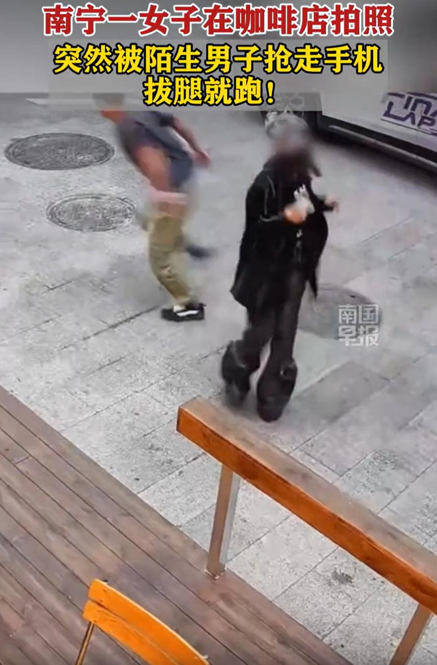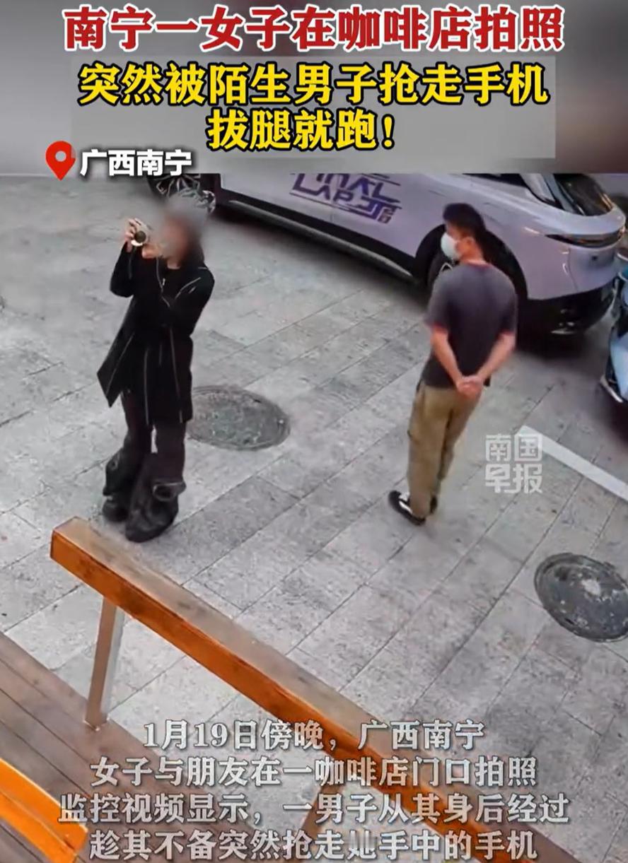 无知者无畏!广西南宁,两名女生在咖啡馆门前打卡拍照,没想到却被一名陌生男子盯上,男子更是当街抢走女生手机,拔腿就跑,别说两名女生,就连网友都懵了:这都啥年代了,抢手机跑得了吗? 监控显示,当时两名女生站在咖啡馆门前拍照,这时一名戴着口罩的男子背着手就靠近过来,起初两人还以为他是站旁边看热闹的,虽然有些反感但也没在意,可几秒后,男子突然上手把手机抢走,然后就跑掉了 两名女生也是被吓了一跳,连忙追赶过去,而根据咖啡店工作人员称,后来男子把手机扔掉后逃跑离开了,目前他们已经报警 这段监控被发到网上后,很多网友都不理解,他为什么要这么做,难道不知道满大街都是监控吗? 其中有网友发现了一个细节,表示女生在手机上加装了摄像头套件,可能被男子看成是一个相机,给抢走了 这个推测听起来有点道理。但不管是手机还是相机,性质都一样,光天化日之下,伸手就抢,这行为实在太恶劣了。你说他无知吧,他可能真没意识到现在的天网系统有多密;你说他无畏吧,这种慌不择路的做法,又显得又蠢又冲动 从另一个角度看,这也给我们提了个醒:出门在外,贵重物品还是要多留个神。拍照、等人、休息的时候,手机相机别太随意拿在手里,尤其在人杂的地方,稍微收一下,或者握紧一些,总没坏处。不是说要人人自危,但多一分小心,就少一分被盯上的可能