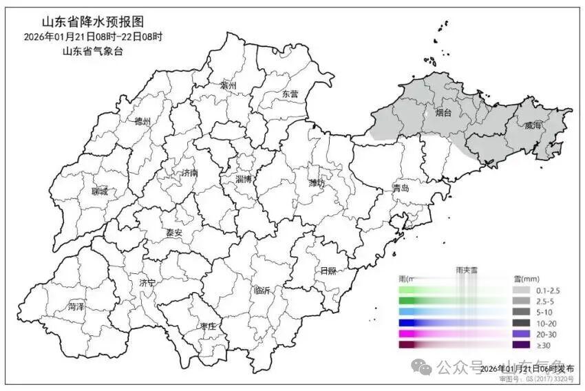 预计21日白天到夜间,烟台北部和威海天气多云间阴有小雪,其他地区天气晴间多云。受降雪影响,鲁南和半岛北部地区仍将出现对交通有较大影响的积雪和道路结冰。21—22日仍将有持续低温天气,22日早晨最低气温:滨州、东营、枣庄、鲁中山区和半岛内陆地区-12~-10℃,沿海地区-7~-5℃,其他地区-10~-8℃。为此,山东省气象台继续发布道路结冰橙色预警和低温黄色预警。