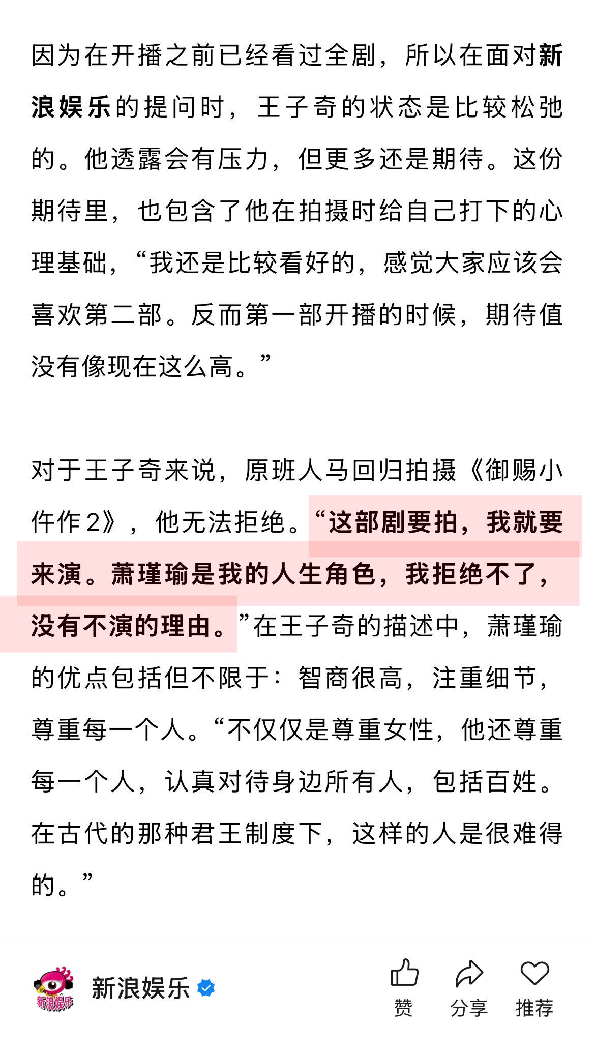 王子奇说年龄不是焦虑而是财富王子奇说自己无法拒绝萧瑾瑜对于王子奇来说,原班人马回归拍摄《御赐小仵作2》,他无法拒绝。“这部剧要拍,我就要来演。萧瑾瑜是我的人生角色,我拒绝不了,没有不演的理由。”在王子奇的描述中,萧瑾瑜的优点包括但不限于:智商很高,注重细节,尊重每一个人。“不仅仅是尊重女性,他还尊重每一个人,认真对待身边所有人,包括百姓。在古代的那种君王制度下,这样的人是很难得的。”对于当下的青年演员而言,如果发展较为平顺,就会出现一些“资源咖、待爆咖”之类的讨论。当新浪娱乐 工作室询问王子奇是否会介意这些称号时,他笑着反问我:“你觉得我是什么咖呢?我什么咖都不是,我只是在一部一部地诠释我想要演绎的角色和作品,这就可以了。”