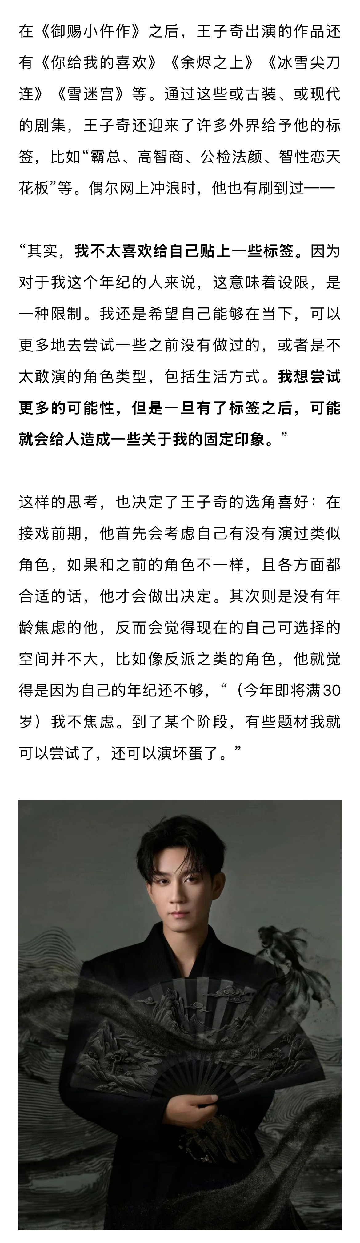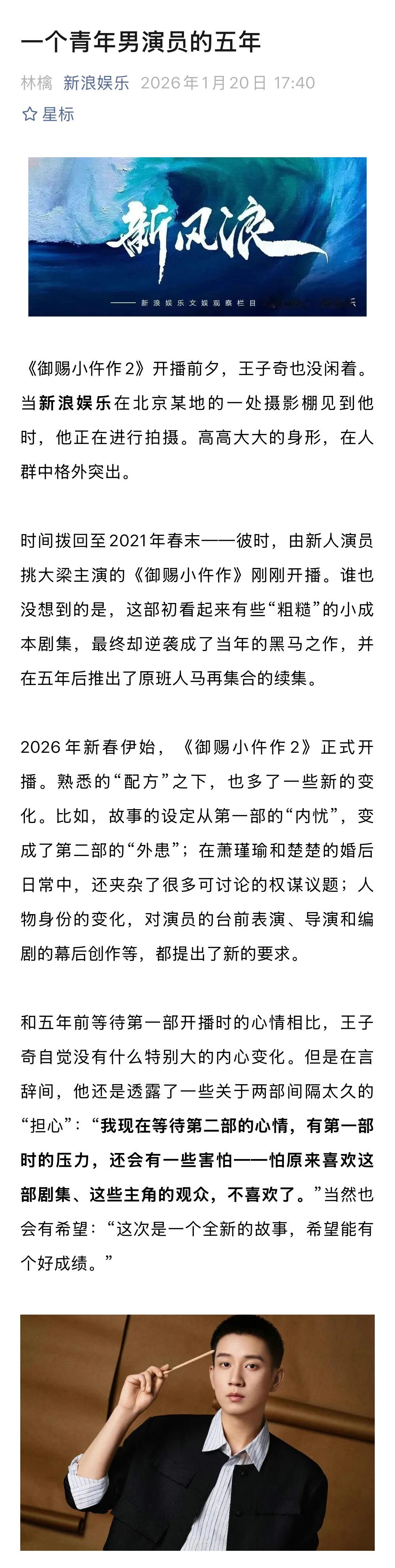 王子奇说自己无法拒绝萧瑾瑜 王子奇说年龄不是焦虑而是财富 对于来说,原班人马回归拍摄《御赐小仵作2》,他无法拒绝。“这部剧要拍,我就要来演。萧瑾瑜是我的人生角色,我拒绝不了,没有不演的理由。”萧瑾瑜曾被称为“人设天花板”,但在王子奇看来,“虽然萧瑾瑜是一个没有什么缺点的人,但是每位观众心中都有自己所认可的‘天花板’。没有人可以成为所有人心中的‘天花板’。现实生活中的我们,也不可能做到被每一个人喜欢,总会有人讨厌、不喜欢,觉得这个人有不好的地方。”就当下的影视环境而言,《御赐小仵作》播出后的这五年来,王子奇的选择空间是没有太大变化的,“感觉还是那几类。”但是这并非演员个人的选择问题,而是在影视剧开机率一降再降的当下,相较于过去,行业内能够给予各方可尝试的题材、类型等,都在变少。作为演员,王子奇能做的选择不多,但也不会因此而产生压力,反而心态更加平和:“有的拍就不错了。”对于当下的青年演员而言,如果发展较为平顺,就会出现一些“资源咖、待爆咖”之类的讨论。当新浪娱乐询问王子奇是否会介意这些称号时,他笑着反问我:“你觉得我是什么咖呢?我什么咖都不是,我只是在一部一部地诠释我想要演绎的角色和作品,这就可以了。”在王子奇看来,外界投射而来的评价和目光,不是他需要关注的重点,他不会因此而焦虑,更不会为此而内耗。“我觉得对于我来说,只要能好好学习表演,能够不断提高自己的业务能力,总会有好的角色被观众看见。与其焦虑热度、流量这些话题,不如花点时间提升自己。”更多内容,请戳…娱理独家↓