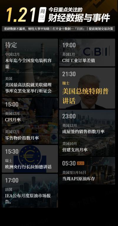 今日重点关注的财经数据与事件:2026年1月21日 周三① 待定 美最高法院就库克案听取辩论② 15:00 英国12月零售物价指数月率③ 15:00 英国12月CPI月率④ 15:30 欧洲央行行长拉加德讲话⑤ 17:00 IEA公布月度原油市场报告⑥ 19:00 英国1月CBI工业订单差值⑦ 21:30 美国总统特朗普发表讲话⑧ 23:00 美国10月营建支出月率⑨ 23:00 美国12月成屋签约销售指数月率⑩ 次日05:30 美国至1月16日当周API原油库存黄金金价突破4800美元黄金涨飞了